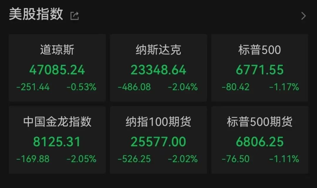 【 导读 】 隔夜美股暴跌 中国基金报记者 储是 "大空头"点燃估值 焦虑, 隔夜美股市场三大指数全线重挫, 中概股、黄金和原油等均难逃 拖累。 "大空头"点燃估值 焦虑 在"大空头"的警示下,隔夜美股市场在预期中调整。 截至收盘, 标普 500指数 下 跌 1.17%,纳斯达克综合指数 下 跌2.04%,道琼斯工业平均指数 下 跌0.53%。 | 美股指数 它 | | | | --- | --- | --- | | 道琼斯 | 纳斯达克 | 标普500 | | 47085.24 | 23348.64 | 6771.55 | | -251.44 -0.53% | -486.08 -2.04% | -80.42 -1.17% | | 中国金龙指数 | 纳指100期货 | 标普500期货 | | 8125.31 | 25577.00 | 6806.25 | | -169.88 -2.05% | -526.25 -2.02% | -76.50 -1.11% | 根据美国证券交易委员会(SEC)披露,电影《大空头》原型、对冲基金经理迈克尔·伯里 (Michael Burry)旗下的赛恩资产管理公司(Scion Ass ...