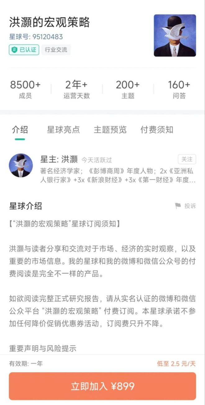 记者丨易妍君,见习记者刘夏菲 编辑丨巫燕玲 10天吸金超760万,昔日的券商首席也吃上了"流量红利"。 "应广大读者的需求,我的星球正式上线。"10月25日,知名经济学家洪灏在个人微信公众号上宣布开启 知识付费新尝试。 截至11月3日发稿,在短短10天时间里,洪灏的个人知识星球成员数突破8500人,以899元/年的订阅价 计算,毛收入预计已超764万元。这一数字已远超不少券商首席分析师的年薪。 对于星球内容,洪灏介绍,"星球是付费研究报告的增值服务,主要以短平快的节奏,实时分享我对于 市场的观察和机会,以及其它与投资相关的重要信息。" 图:洪灏的个人知识星球页面 公众号付费内容4个月赚超160万 事实上,洪灏在知识付费领域早有探索。早在2024年6月,洪灏就在其个人公众号中发布了付费阅读文 章。 截至目前,洪灏个人公众号最新的一篇付费文章更新于11月3日上午,单篇解锁价格为1999微信豆(合 199.9元)。此外,洪灏还在公众号中定期更新付费合集。 21世纪经济报道记者了解到,其公众号付费合集每集收录约20~25篇研报,每个合集定价为10000个微 信豆(合1000元),每集更新周期约2~3个月。其最新的一个 ...