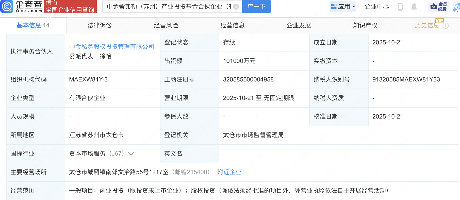 | 6 | + | | 太仓高新投资管理有限公司 | 9.9010% | | --- | --- | --- | --- | --- | | | | 投资 | 国有企业 | | | 7 | + | 交投 | 湖北交投临空港陆港枢纽股权投资基金合伙企业(有限合伙) | 4.9505% | | | | | 国有企业 私募基金 | | | | | 中金 | 中金私募股权投资管理有限公司 | 4.3564% | | | | 私募 | 国有企业 执行事务合伙人 私募基金管理人 | | | 8 | 11 D | | | | | | 级 | + | 中国国际金融股份有限公司 | 100% | | | 服 东 | | | | 企查查APP显示,近日,中金舍弗勒(苏州)产业投资基金合伙企业(有限合伙)成立,出资额约10亿元,经营范围包含:创业投资(限投资未上市企 业);股权投资。企查查股权穿透显示,该企业由中金公司(601995)全资子公司中金私募股权投资管理有限公司等共同出资。 | 全国企业信用查询 | | 中金舍弗勒(苏州)产业投资基金合伙企业(1 ◎ | 查一下 | | --- | --- | --- | --- | | ...