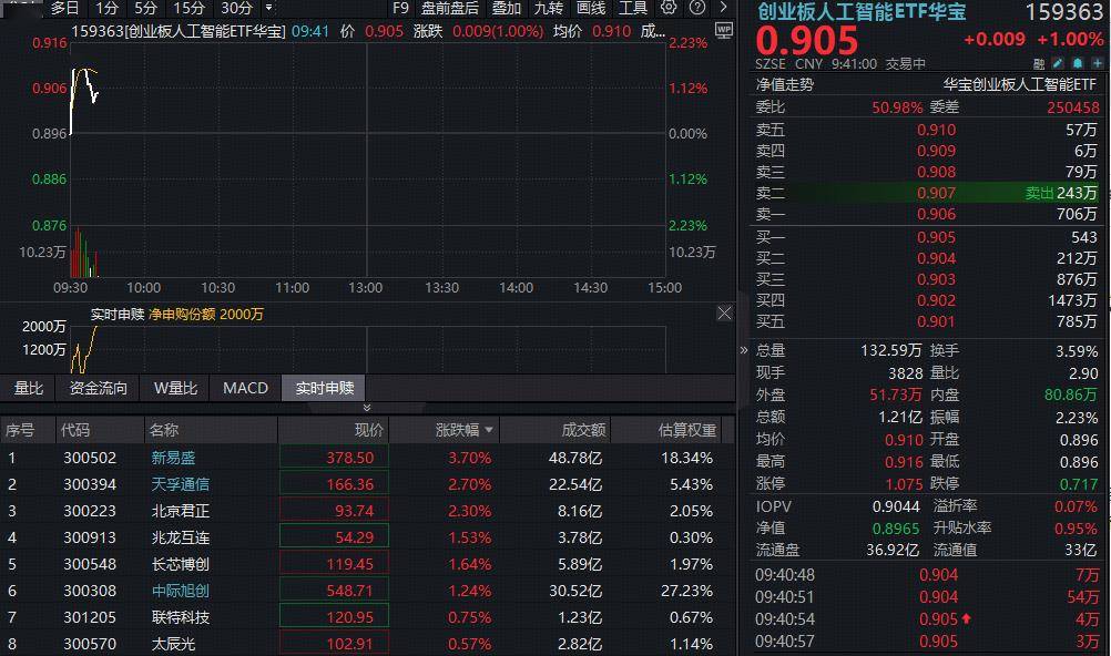 12月1日,算力概念领涨,创业板人工智能涨超2%,成份股大面积飘红。其中,算力卫星概念股航宇微盘中20CM涨停,截至发稿仍大涨超 15%,存储芯片北京君正涨超14%,光模块龙头中际旭创涨超5%,润泽科技、星宸科技、富瀚微、全志科技、金信诺等多股跟涨超3%。 热门ETF方面,超七成仓位布局算力的创业板人工智能ETF(159363)场内再涨2%,放量成交超6亿元,资金重启净申购2000万份。 | 分时 多日 1分 5分 15分 30分 7 综合屏 F9 前复权 超级叠加 画线 工具 Q 2 | | | 创业板人工智能ETF华宝 | 159363 | | --- | --- | --- | --- | --- | | 159363.SZ[创业板人工智能ETF华宝] 2025/12/01 收 0.897 幅 2.28%(0.020) 开 0.881 高 0.909 低 | WP | 0 33 | | +0.020 +2.28% | | MA5 0.8741 MA10 0.851] MA20 0.8521 MA60 0.8551 MA120 0.727] 2025/08/29-2025/12/01(61日)▼ | | ...