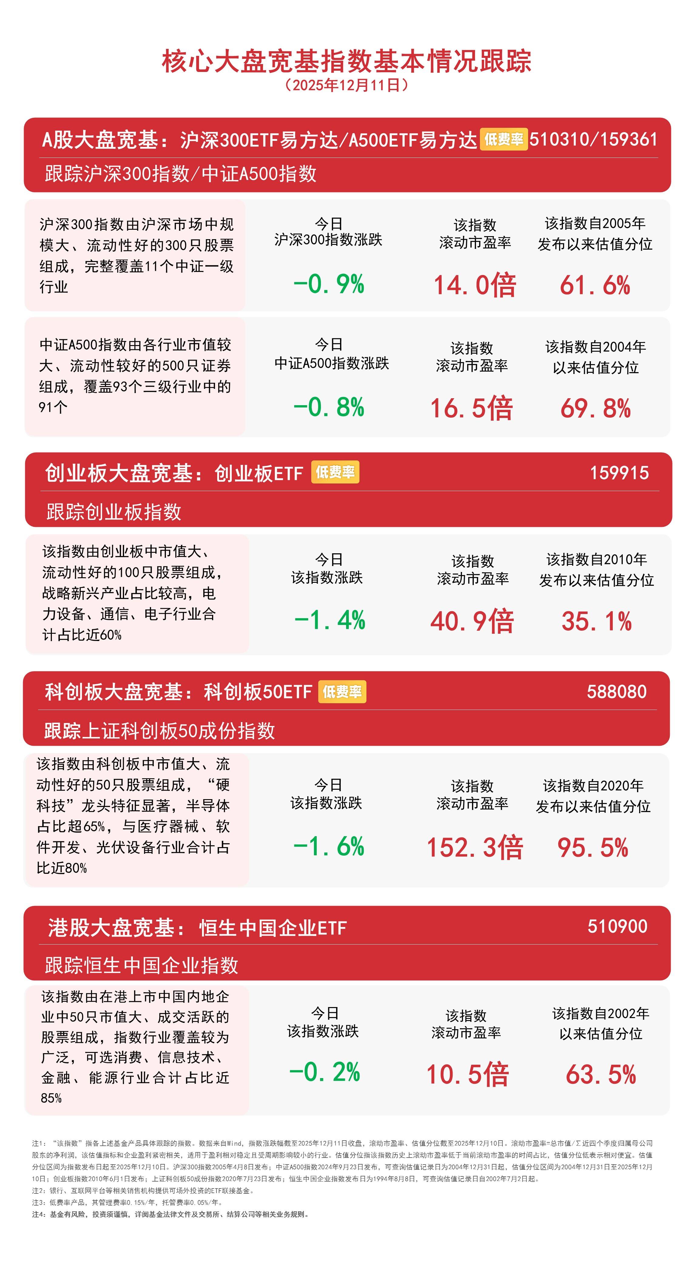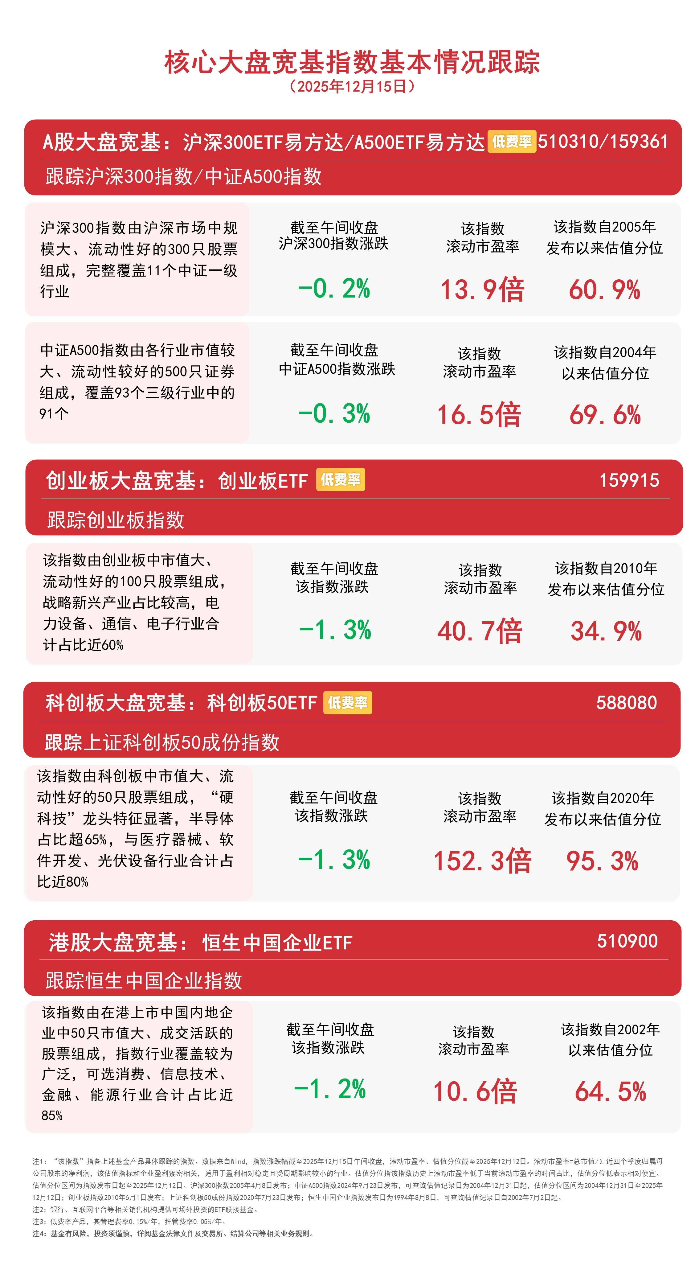 A股三大指数早盘低开低走,板块题材上,乳业、零售、保险板块活跃,海南、影视院线、光伏、半导体等板块调整;港股全线走弱,科技股领跌。截至中 间收盘,中证A.500指数下跌1.7%,沪深300指数下跌1.4%,创业板指数 下跌2.4%,上证科创板50成份指数下跌2%,恒生中国企业指数下跌2.1%。 核心大盘宽基指数基本情况跟踪 (2025年12月16日) A股大盘宽基:沪深300ETF易方达/A500ETF易方达 旺费率 跟踪沪深300指数/中证A500指数 沪深300指数由沪深市场中规 模大、流动性好的300只股票 组成,完整覆盖11个中证一级 行业 截至午间收盘 中证A500指数由各行业市值较 中证A500指数涨跌 大、流动性较好的500只证券 沪深300指数涨跌 -1. 4% 该指数 滚动市盈率 -1.7% 16.6倍 创业板大盘宽基:创业板ETF | | 跟踪创业板指数 该指数由创业板中市值大、 流动性好的100只股票组成, 战略新兴产业占比较高,电 力设备、通信、电子行业合 计占比近60% 该指数 滚动市盈率 13.9倍 截至午间收盘 该指数涨跌 该指数 滚动市盈率 2 4% 40.0倍 科创板大盘宽基 ...