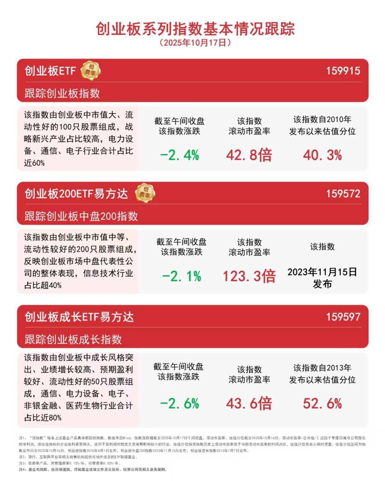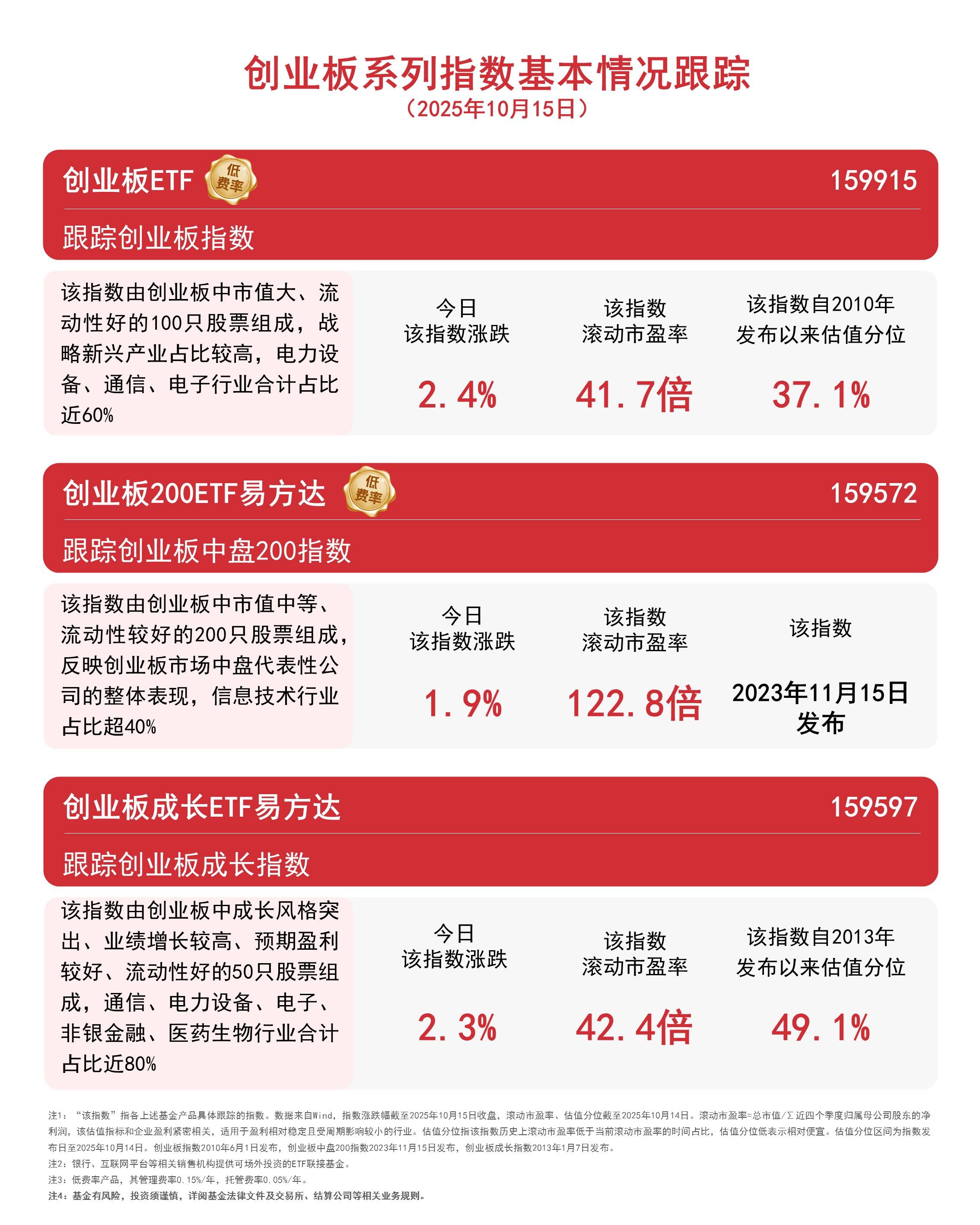 | | 创业板 | 创业板中盘 | 创业板成长 | | --- | --- | --- | --- | | | 指数 | 200指数 | 指数 | | 本周涨跌幅 | -5. 7% | -5. 7% | -6. 0% | | 指数滚动 市盈率 | 42. 8倍 | 123. 3倍 | 43.6倍 | | 滚动市盈率 分位 | 40. 3% | 该指数2023年 11月15日发布 | 52. 6% | | 跟踪该 | 创业板ETF | 创业板200ETF | 创业板成长ETF | | 指数的ETF | (159915) | 易方达 (159572) | 易方达 (159597) | | ਨ | 创业板指数 | | | 国创业极中中值天、流切性对的100只放宗组成, 战略新兴产业占比较高,电力设备、通信、电子 行业合计占比近60% 今日创业板指数下跌3.4%,创业板ETF(159915)全天净申购超1亿份。从周维度看,创业板整体呈现回调态势,主要受科 技类板块短期调整影响,但周中新能源、生物医药等领域均局部活跃,或反映出市场对优质成长标的的配置意愿不减,指 数方面,创业板指数下跌5.7%,创业板中盘200指数下跌 ...