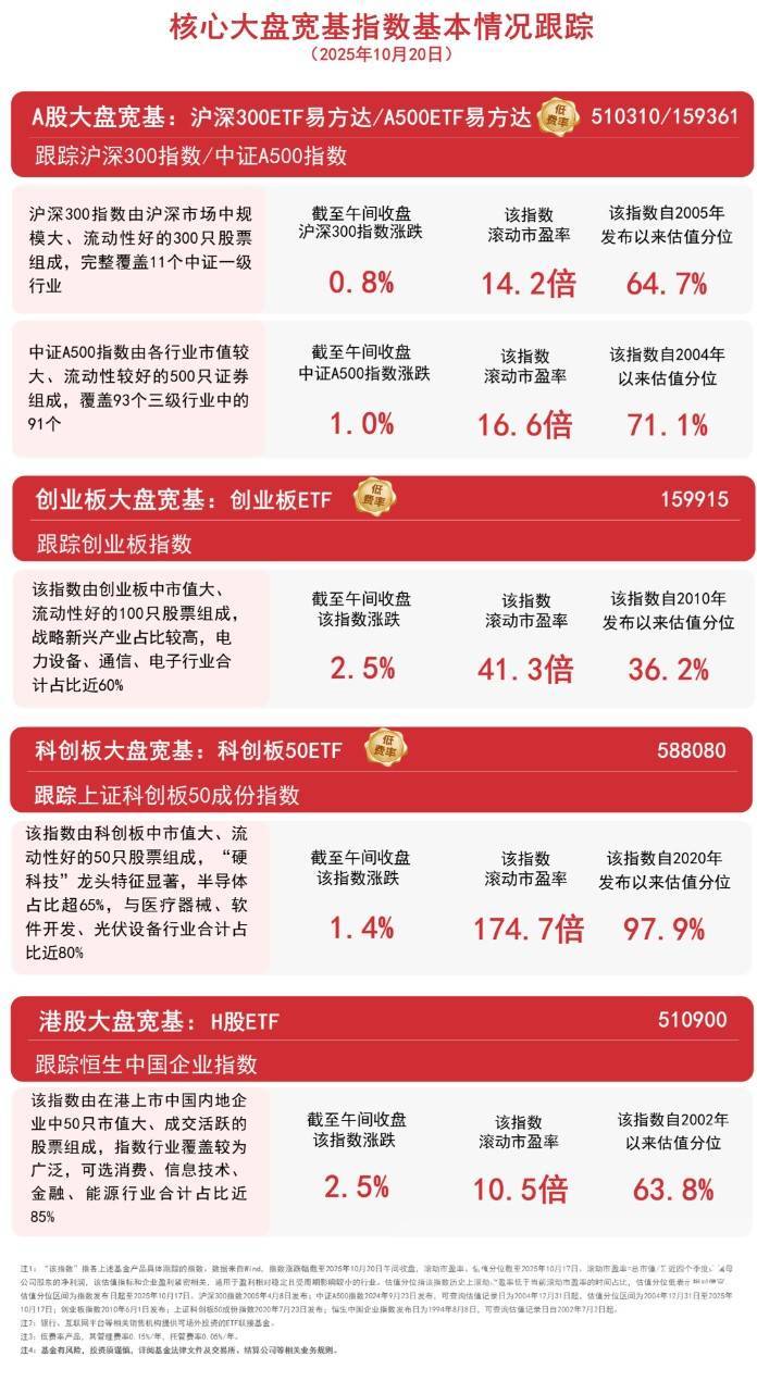 A股三大指数早盘集体上行,创业板指半日涨2.5%重回3000点,全市场超4200只个股上涨。板块题材方 面,电机、煤炭开采加工、CPO、脑机接口、电池板块涨幅居前,黄金概念、银行、猪肉、稀土永磁板 块跌幅居前;港股早盘高开高走,科技板块涨幅居前,黄金珠宝、有色金属等板块跌幅居前。截至午间 收盘,中证A500指数上涨1.0%,沪深300指数上涨0.8%,创业板指数上涨2.5%,上证科创板50成份指数 上涨1.4%,恒生中国企业指数上涨2.5%。 | 港服人益苑巷:「版EIF | | | OUYUU | | --- | --- | --- | --- | | 跟踪恒生中国企业指数 | | | | | 该指数由在港上市中国内地企 | | | | | 业中50只市值大、成交活跃的 | 截至午间收盘 | 该指数 | 该指数自2002年 | | 股票组成,指数行业覆盖较为 | 该指数涨跌 | 滚动市盈率 | 以来估值分位 | | 广泛,可选消费、信息技术、 | | | | | 金融、能源行业合计占比近 | 2. 5% | 10.5倍 | 63.8% | | 85% | | | | 每日经济新闻 | 沪深300指数由沪深市 ...