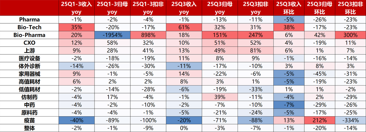 一、整体情况: 25Q1-3医药板块整体收入-2%,归母净利润-1%,扣非归母净利润-9%;25Q3医药板块整体收入+0%,归母净利润-3%,扣非归母净利润-7%,各项增速环比 25Q2持续改善。 细分领域表现:25Q3药品尤其是创新药板块收入增速表现较好,利润端增速较好的子版块主要是Bio-Pharma、CXO和上游。 增速环比趋势:23Q1以来医药整体收入增速基本维持微增或微降。结构分化较大,其中Bio-pharma收入增速表现持续强劲,23Q1以来基本每个季度均为收 入增速最快的子版块,此外,CXO和上游的收入增速改善趋势明显。利润端表现类似。 | | 25Q1-3收入 | 25Q1-3归母 | 25Q1-3扣非 | 25Q3收入 | 25Q3归母 | 25Q3扣非 | 25Q3收入 | 25Q3归母 | | --- | --- | --- | --- | --- | --- | --- | --- | --- | | | yoy | yoy | yoy | yoy | yoy | yoy | 环比 | 环比 | | Pharma | -1% | -2% | -4% | -1% | -13% | -11 ...