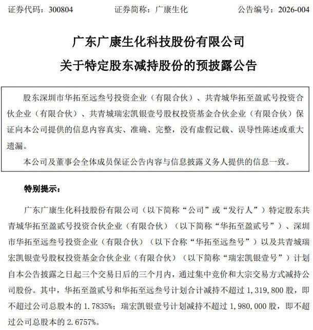 减持计划公告 - 广康生化于2月11日公告,收到特定股东华拓至盈贰号、华拓至远叁号及瑞宏凯银壹号的减持计划告知函 [1] - 上述股东计划自公告披露之日起三个交易日后的三个月内,通过集中竞价和大宗交易方式减持公司股份 [1] - 华拓至盈贰号和华拓至远叁号计划合计减持不超过131.98万股,占公司总股本的1.7835% [4] - 瑞宏凯银壹号计划减持不超过198万股,占公司总股本的2.6757% [4] 股东持股与减持历史 - 根据公告前持股情况,华拓至盈贰号持有884,400股,占总股本1.1951% [5] - 华拓至远叁号持有435,400股,占总股本0.5884% [6] - 瑞宏凯银壹号持有1,980,000股,占总股本2.6757% [6] - 华拓至盈贰号和华拓至远叁号由同一基金管理人管理,合计持股131.98万股(占总股本1.7835%),减持股份数量合并计算 [4] - 从持股情况看,上述特定股东准备进行“清仓式”减持 [7] - 瑞宏凯银壹号曾在2025年10月计划减持不超过198万股,但计划期限届满后未实施减持 [7] - 华拓至盈贰号、华拓至远叁号于2025年9月也曾公告拟减持,减持后华拓至远叁号持股比例由0.6022%降至0.5884%,华拓至盈贰号在减持期间未减持股份 [7] 公司近期状况与股价表现 - 广康生化是专业从事农药原药、中间体、制剂的研发、生产和销售的国家高新技术企业 [8] - 一个月前,公司收到了广东证监局下发的警示函 [8] - 警示函指出,2023年7月至2025年8月期间,公司使用募集资金循环购买179笔理财产品,其中158笔为非保本理财产品 [10] - 2023年、2024年、2025年购买非保本理财产品分别为14笔、68笔、76笔 [10] - 公司在相应年度《募集资金存放与使用专项报告》中未充分提示非保本理财产品的本金损失风险及本金安全性问题,不符合规定 [10] - 此次减持公告发布时点正值公司股价从低位反弹之际,2月6日至11日,公司股价整体上涨近20% [10] - 2月12日开盘后股价一度下跌,但随后逆势回涨,截至午间收盘,股价上涨超过5% [10] - 根据2月12日盘中数据,公司股价为40.04元,上涨2.33元,涨幅5.29% [12] - 当日成交额为2.90亿元,总市值为34.29亿元,流通市值为12.74亿元 [12]