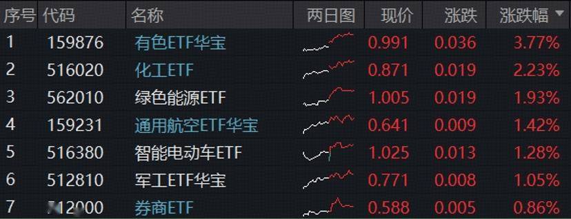 12月26日,三大指数继续上涨,沪指录得8连阳,年末重返4000点或势在必得。两市成交额2.18万亿 元,创12月新高。 | 序号 代码 | | 名称 | 两日图 现价 | 涨跌 涨跌幅 ▼ | | | --- | --- | --- | --- | --- | --- | | 1 159876 | | 有色ETF华宝 | 0.991 0.036 . | | 3.77% | | 2 | 516020 | 化工ETF | 0.871 0.019 | | 2.23% | | 3 | 562010 | 绿色能源ETF | 1.005 0.019 | | 1.93% | | ব | 159231 | 通用航空ETF华宝 | 0.641 0.009 | | 1.42% | | ર | 516380 | 智能电动车ETF | 1.025 0.013 | | 1.28% | | 6 | 512810 | 库工ETF华美 | 0.771 0.008 | | 1.05% | | 7 | 512000 | 券商ETF | ------ 0.588 0.005 | 0.86% | | 盘面上,有色金属继续狂飙,场内热门的有色ETF ...