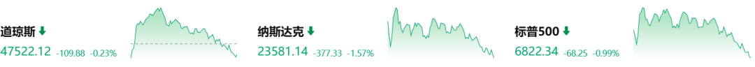 美股市场表现 - 美股三大指数全线下跌,道琼斯指数跌0.32%至47185.13点,标普500指数跌0.64%至6808.45点,纳斯达克综合指数跌1.01%至23594.72点 [1][2] - 主要股指期货同步走弱,纳指100期货跌0.93%,标普500期货跌0.72% [2] - 明星科技股多数下跌,英特尔领跌超4%,特斯拉跌3.53%,英伟达跌超2% [2][3] - 纳斯达克中国金龙指数跌1.4%至8179.23点,成分股中文远知行跌7.61%,小马智行跌7.18%,小鹏汽车跌3.64% [3][4] 全球其他市场表现 - 欧洲主要股指全线走弱,德国DAX30指数跌超1%,法国CAC40指数跌0.93%,英国富时100指数跌0.5% [4] - 亚洲市场普遍收跌,韩国首尔综指大幅收跌2.4%,日经225指数收跌1.7%,恒生指数跌0.79% [5] 大宗商品市场 - 黄金价格大幅下挫,现货黄金一度大跌1.8%,发稿时跌幅收窄至1.4%,报3944.9美元/盎司 [5][6] - 白银跌1.8%报47.2美元/盎司,铜、锌等金属全线下跌 [7] - 国际油价小幅下挫,布油报64.22美元/桶跌1.03%,WTI原油报60.34美元/桶 [8][9] 加密货币市场 - 加密货币全线重挫,比特币跌超3%报104289美元/枚,以太坊跌4.30% [11][12] - 24小时内加密货币全市场爆仓金额达13.99亿美元,超过34万人被爆仓 [11] - 主要币种普遍下跌,SOL跌6.75%,BNB跌5.70% [12] 市场情绪与驱动因素 - 市场抛售的导火索是AI概念股Palantir股价大跌,加剧了市场对科技股估值过高的担忧 [13] - Palantir第三季度营收11.8亿美元,同比大增63%,并上调第四季度业绩预期至13.3亿美元 [13] - 华尔街高管警告美股市场可能面临10%至20%的重大回调,对科技股估值表示谨慎 [14] - 标普500指数的远期市盈率被推升至23倍以上,接近2000年以来的最高水平 [14] - 分析指出美股对宏观数据疲软或美联储政策路径转变越来越敏感 [15]