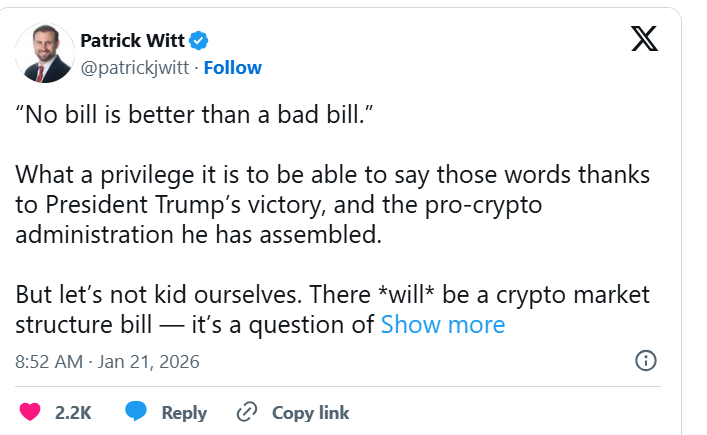 总部位于美国的全球最大规模加密货币交易所之一Coinbase(COIN.US)的强势举动引发加密货币领域重大裂痕,这也导致关 键监管法案延迟。据了解,白宫甚至罕见对加密货币行业提出批评声音:不要把你在华盛顿新获得的政治影响力视为理所 当然。 在Coinbase首席执行官Brian Armstrong帮助拖延了美国参议院关于加密货币的全面立法一周后,白宫加密顾问Patrick Witt通 过X社交平台表达了他针对Armstrong的不同意见,Armstrong曾警告声称"没有法案比一个过于糟糕的法案更好"。Witt在推 文中写道:"你可能不喜欢CLARITY法案《CLARITY Act》的每一部分,但我可以保证,你会更讨厌未来民主党版本的法 案。" 悬在多方争论上方的是今年的中期选举,这可能会导致一个更加不友好的美国国会,而加密货币行业仍在从此前拜登政府 的打压中积极恢复。 《CLARITY Act》——即《美国数字资产市场清晰度法案/CLARITY Act》,对全球加密货币市场的影响规模相当大。这部 法案的核心目标是为数字资产建立一套全面、明确的联邦监管框架,包括界定不同类型加密资产(如数字商品、证券等)的 ...