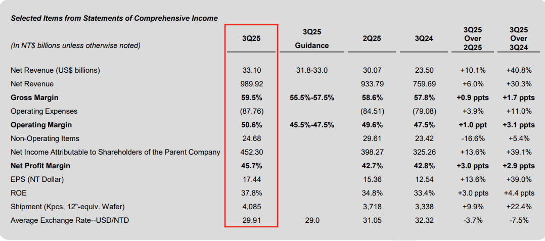 受益于人工智能基础设施投资热潮加速,台积电最新财报显示净利润同比增长39%,超出市场预期,创下历史新高。 | Selected Items from Statements of Comprehensive Income | | | | | | | | --- | --- | --- | --- | --- | --- | --- | | | 3Q25 | 3Q25 | 2025 | 3Q24 | 3Q25 Over | 3Q25 Over | | (In NT$ billions unless otherwise noted) | | Guidance | | | 2Q25 | 3Q24 | | Net Revenue (US$ billions) | 33.10 | 31.8-33.0 | 30.07 | 23.50 | +10.1% | +40.8% | | Net Revenue | 989.92 | | 933.79 | 759.69 | +6.0% | +30.3% | | Gross Margin | 59.5% | 55.5%-57.5% | 58.6% | 57.8% | +0.9 ppts ...