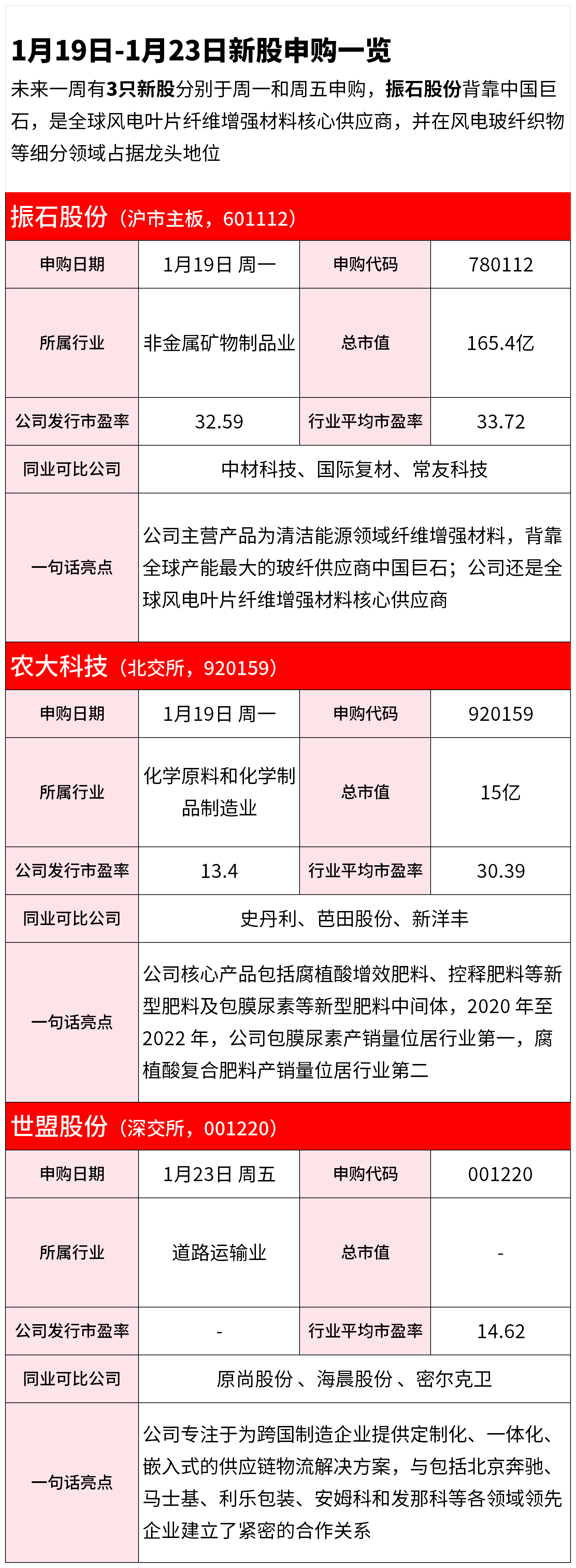 新股申购信息 - 未来一周(1月19日至1月23日)有3只新股进行申购,分别为1月19日申购的振石股份和农大科技,以及1月23日申购的世盟股份 [1] 振石股份 (601112) - 公司将于1月19日于沪市主板进行申购 [1] - 所属行业为非金属矿物制品业 [1] - 公司发行市盈率为32.59 [1] - 同业可比公司包括中材科技、国际复材 [1] - 公司主营产品服务于清洁能源领域,是全球风电叶片纤维增强材料核心供应商,并在该细分领域占据龙头地位 [1] - 公司是全球产能最大的玻纤供应商 [2] 农大科技 (920159) - 公司将于1月19日于北交所进行申购 [3] - 所属行业为化学原料和化学制品制造业 [3] - 公司发行市盈率为13.4 [3] - 同业可比公司包括史丹利、芭田股份 [3] - 公司核心产品包括腐植酸增效型肥料及包膜尿素等新型肥料 [3] - 2022年,公司包膜尿素产销量及腐植酸复合肥料产销量位居行业前列 [3] 世盟股份 (001220) - 公司将于1月23日于深交所进行申购 [4] - 所属行业为道路运输业 [4] - 同业可比公司包括原尚股份、海晨股份 [4] - 公司专注于为跨国制造企业提供嵌入式的供应链物流解决方案 [4] - 公司与马士基、利乐包装、安姆科等企业建立了紧密的合作关系 [4]