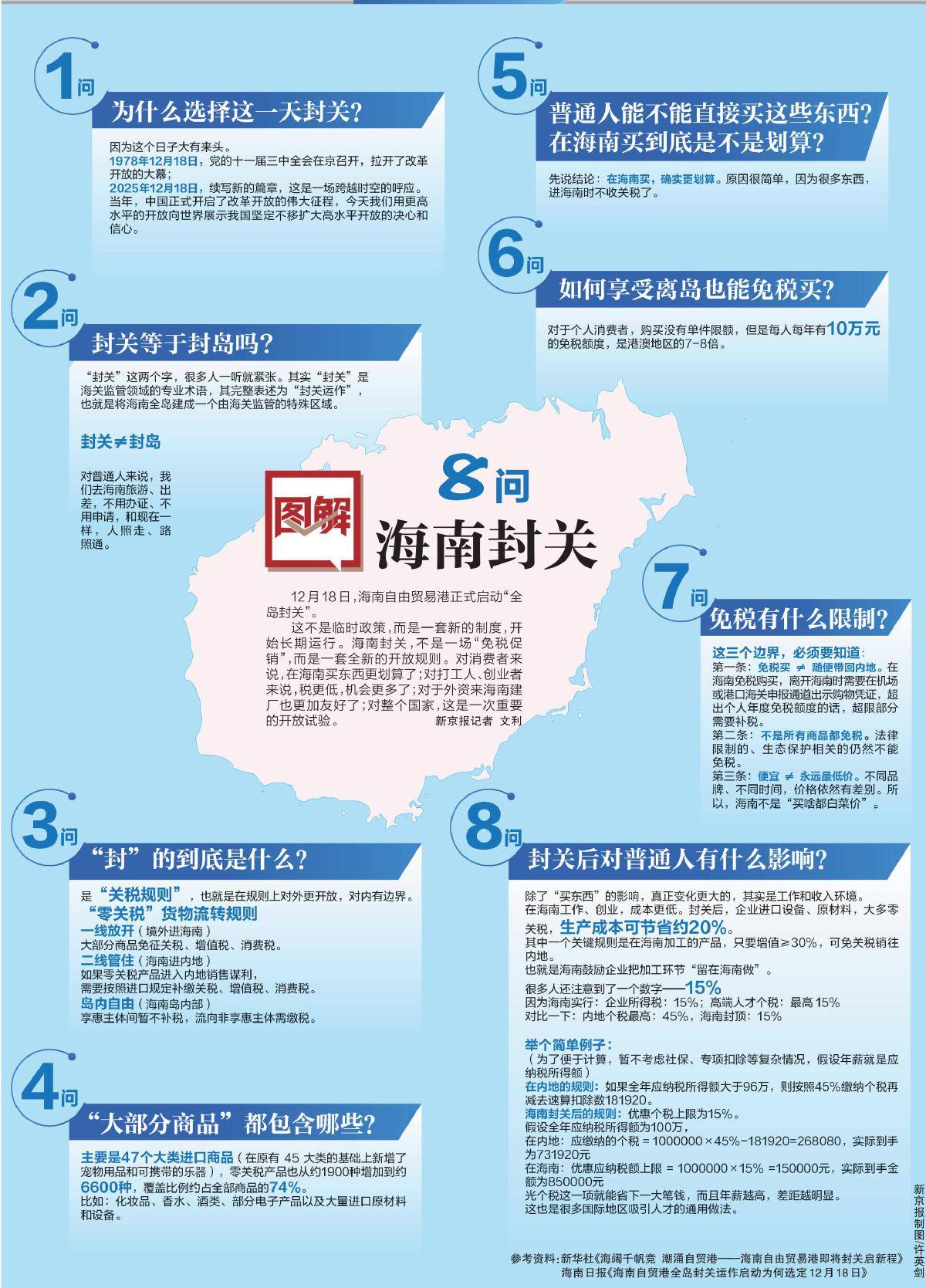 今日,即2025年12月18日,是一个注定被载入中国经济史册的日子。 从这一刻起,海南岛不再仅仅是一个地理概念,它正式成为中国经济与世界交融的一块试验田,从今天开始,海南全岛封关运作的大幕,轰然拉开。 在逆全球化思潮涌动的今天,我们选择以更大的魄力,拥抱世界,为全球资本和企业提供一个充满确定性的避风港。这背后,是中国坚定不移的开放决心, 也是一场旨在重塑国内经济格局的深刻变革。 那么,这场变革的核心逻辑是什么?可以概括为:一线放开、二线管住、岛内自由。 我们可以想象一下,未来的海南就像一个巨大的、连接全球的超级购物中心。面向全球,它彻底敞开大门,除了少数限制品,绝大多数货物都能自由进出, 免征关税。背靠内地,会有一道精准的防火墙,确保优惠政策精准落地,不冲击国内市场。而在这座巨大的"境内关外"岛屿上,自由流动将成为常态。 支撑这一切的,是"零关税、低税率、简税制",我们既能看到国际成熟自贸港的影子,又烙印着鲜明的中国特色,这是一次值得关注的制度创新。 抛开宏大叙事,它将如何搅动我们每个人的生活与生意呢? 对于消费者而言,"零关税"意味着进口商品价格的大幅下降,加上离岛免税政策的持续加码,海南正加速成为全球消费 ...