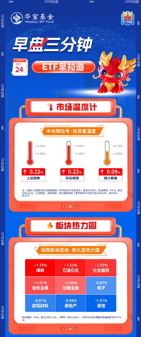 市场指数表现 - 截至2025年10月23日,上证指数近十年市盈率分位数为99.22%,深证成指为80.04%,创业板指为46.17% [1] - 当日主要指数涨跌情况:上证指数上涨0.22%,深证成指上涨0.09%,创业板指上涨0.22% [1] 行业板块短期表现 - 当日涨幅居前行业:煤炭板块上涨1.75%,社会服务板块上涨1.52%,石油石化板块上涨1.07% [1] - 当日跌幅居前行业:通信板块下跌1.51%,房地产板块下跌0.99%,建筑材料板块下跌0.91% [1] 行业资金流向 - 当日主力资金净流入前三板块:煤炭板块净流入8.12亿元,传媒板块净流入2.495亿元,综合板块净流入1.31亿元 [2] - 当日主力资金净流出前三板块:机械设备板块净流出42.22亿元,医药生物板块净流出36.79亿元,通信板块净流出32.48亿元 [2] 重点ETF交易表现 - 化工ETF(516020)当日上涨2.06%,近6月涨幅达27.27% [2] - 有色龙头ETF(159876)当日上涨1.41%,近6月涨幅达57.51% [2] - 绿色能源ETF(562010)当日上涨1.38%,近6月涨幅达38.64% [2] - 港股互联网ETF(513770)当日上涨1.02%,近6月涨幅为19.16% [2] - 金融科技ETF(159851)当日上涨0.92%,近6月涨幅为24.87% [2] 重点ETF资金动向 - 银行ETF(512800)成交额21.19亿元,单日净申购39.76亿元,换手率9.89% [2] - 券商ETF(512000)成交额13.61亿元,单日净申购38.80亿元,换手率3.52% [2] - 港股互联网ETF(513770)成交额7.92亿元,单日净申购1.61亿元,换手率7.23% [2] 化工行业分析 - 化工板块强势反攻,细分化工产业主题指数当日涨幅超过2% [3] - 氟化工、石化、钾肥等细分板块标的涨幅居前 [3] - 中国化工产业链竞争优势明显,凭借成本优势和技术实力,有望重塑全球化工产业格局 [3] 港股互联网行业分析 - 港股通互联网指数水下拉升,尾盘强势逆转收红1% [3] - 港股互联网巨头受益于AI叙事发酵,资产结构优势有望凸显 [3] - 伴随美联储重启降息,港股外资力量回流存在超预期可能,南向资金持续流入推动行情向上 [3] 重点ETF产品信息 - 化工ETF(516020)跟踪细分化工产业主题指数,基日为2004年12月31日,指数代码000813 [5] - 港股互联网ETF(513770)跟踪中证港股通互联网指数,基日为2016年12月30日,指数代码931637 [5]