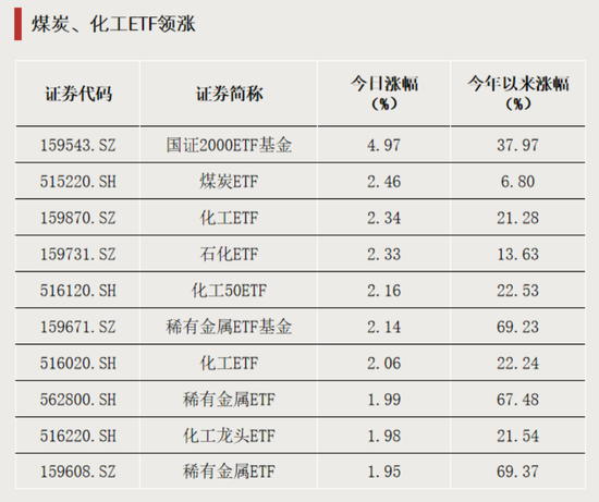 市场整体表现 - 10月23日港股和A股三大指数均上涨,全市场超半数ETF收涨,超百只ETF涨幅超过1% [1] - 煤炭、化工、有色金属板块表现亮眼,涨幅前十的ETF中有9只为主投这三大行业的产品 [1] - 前一交易日(10月22日)ETF市场整体净流入约25亿元 [1] 煤炭板块及ETF表现 - 10月23日煤炭行业板块以1.75%的涨幅领涨申万一级行业 [2] - 煤炭ETF(515220)收涨2.46%,位居全市场ETF涨幅榜第二,其挂钩的中证煤炭指数30只成分股中有29只收涨,7只涨停 [2] - 成分股大有能源连续8个交易日涨停,自10月10日以来累计涨幅超过140% [2] - 板块上涨逻辑为煤价高企叠加红利资产的避险属性 [3] 化工及稀有金属板块及ETF表现 - 多只主投化工、稀有金属的ETF涨幅居前,例如化工ETF(159870)涨2.34%,稀有金属ETF基金(159671)涨2.14% [4] - 相关资产上涨逻辑或是全球流动性宽松以及“反内卷”预期下的资源品涨价 [3] - 部分稀有金属ETF今年以来涨幅显著,如稀有金属ETF(159608)今年涨幅达69.37% [4] 创新药主题ETF表现 - 10月23日主投创新药行业的ETF跌幅较为明显,单日跌幅前十ETF中多为该类产品 [5] - 自9月初以来,多只创新药主题ETF跌幅超过10%,部分产品回吐利润,收益率从翻倍回吐至70%左右 [5] - 在持续回调中,多只产品获得资金逆势净流入,例如恒生医药ETF(159892)在9月1日至10月22日期间获净流入超过7亿元 [5] - 机构认为国内创新药“竞争力提升+BD出海”逻辑未被证伪,四季度事件催化增多 [5] 黄金类ETF资金流向 - 10月22日黄金类ETF虽大幅下跌,但获资金逆势加仓,挂钩SGE黄金9999、上海金指数的黄金类ETF全部获净流入,合计达45.5亿元 [6] - 5只黄金类ETF的单日资金净流入额跻身全市场前十 [6] - 部分黄金类ETF份额创历史新高,例如黄金ETF华夏(518850)份额达9.28亿份,10月以来该基金累计净流入已超过20亿元 [7] 高弹性市场ETF资金流向 - 主投创业板、科创板等高弹性市场的ETF在本周(10月20日至10月22日)遭遇较多资金净流出,本周净流出前十ETF中此类产品占半数 [9] - 跟踪创业板指数的一只ETF净流出规模位居首位,3个交易日净流出额超过30亿元 [9] 机构观点与配置建议 - 机构建议四季度超配权益,标配债券,A股市场风险偏好有望维持高位,但需注意波动率可能放大 [10] - 建议坚守产业高景气核心主线,包括TMT、高端装备、有色、创新药等领域,关注大消费、顺周期等方向的交易性机会 [10] - 全球AI产业浪潮方兴未艾,互联网巨头有望受益于AI算力、大模型、应用等领域的投入 [11] - 人工智能、消费电子等科技板块被认为是市场主线,值得持续关注 [12]