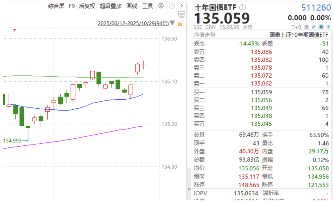 从政策面来看,银行间资金利率自国庆中秋假期后整体偏松,叠加央行重启国债买卖释放乐观信号,资金面宽松有望继续保持。从机构行为来看,交易资 金久期自三季度下行后,又呈现逐步上升的状态。总体而言,债券回暖的趋势仍在,投资者可以关注十年国债ETF(511260)、国债ETF(511010),逢 低布局。 | | | 0.000 0.00% | | --- | --- | --- | | | | T+0 B / 0 + | | 净值走势 | | 国泰上证10年期国债ETF | | 载比 | -14.45% 变差 | -51 | | 卖五 | 135.086 | 40 | | 卖网 | 135.082 | 100 | | 型三 | 135.078 | 1 | | 蓝三 | 135.072 | 60 | | 卖一 | 135.062 | 1 | | 派— | 135.059 | 78 | | 派二 | 135.056 | 2 | | 尚三 | 135.049 | 66 | | 河口 | 135.048 | 1 | | 测 | 135.045 | 4 | | 总量 | 69.48万 换手 | 63.50% | | 现手 |  ...