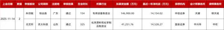 IPO审核结果概览 - 今日2家企业IPO上会全部获审核通过,合计拟募资18.82亿元 [1] - 两家企业分别为科创板的恒运昌和北交所的农大科技 [2] - 两家企业均在审期间调减了拟募资规模 [2][4] 恒运昌基本情况 - 公司注册地包运晶,所属行业为专用设备制造业 [2] - 拟募资规模从上会前的15.50亿元调减至14.69亿元,调减了补流规模 [2] - 原募投项目包括半导体射频电源系统产业化建设等5个项目,总投资额15.99亿元 [3] - 调整后募投项目总投资额降至15.18亿元,补充流动资金从2.50亿元调减至1.69亿元 [3] 农大科技基本情况 - 公司注册地山东,所属行业为优学原料和化学制品制造业 [2] - 拟募资规模从申报稿的5.52亿元调减至上会稿的4.13亿元 [4] - 调整内容为删除年产15万吨微生态制剂系列产品生产项目并调减补流规模 [4] - 最终募投项目包括年产30万吨腐植酸智能高塔复合肥项目等,总投资额4.13亿元 [6][29] 上市委审议关注问题 - 恒运昌被问询成长性及业绩波动风险披露充分性,客户集中度对独立性及合作稳定性的影响 [7][8][9] - 农大科技被问询经营业绩真实性,包括收入下滑但净利润和毛利率增长的原因及合理性 [9] - 农大科技还被问询经营业绩可持续性、募投项目新增产能消化的可行性 [9] 农大科技经营业绩分析 - 2022年至2024年营业收入从26.76亿元持续下降至23.63亿元 [10] - 同期扣非归母净利润从0.92亿元增长至1.42亿元,净利润从1.01亿元增长至1.45亿元 [10][12] - 毛利率从2022年的13.27%提升至2024年的18.83% [12] - 新型肥料收入占比从2022年的74.26%提升至2024年的81.70%,但金额从19.68亿元降至19.24亿元 [12][13][14] - 新型肥料中间体收入2024年同比下降29.93%,普通肥料收入同比下降49.28% [13][14] 农大科技客户与订单情况 - 前五大客户销售占比报告期内分别为21.07%、22.03%和20.39% [14] - 中国邮政集团有限公司为各期第一大客户,销售占比分别为16.38%、15.03%和15.08% [14] - 各期末在手订单金额持续下降,从2022年的6.29亿元降至2024年的3.32亿元,2025年6月底仅剩1.4亿元 [17] - 主营业务收入主要来自老客户,各期占比分别为82.39%、84.09%和87.21% [17] 农大科技内控与收入确认 - 保荐机构底稿显示部分收入确认时间晚于签收时间 [21] - 存在发货短信记录缺失比例较高、过磅记录异常、销售确认函未签字等问题 [21][22] - 监管关注客户自提方式下由公司联系运输公司且以司机签字确认收入的合理性 [22] - 公司解释称已规范内控流程,2025年1-6月短信发送覆盖率达100%,过磅差异率仅0.05% [24][25] 农大科技募投项目调整 - 报告期内主要产品产能利用率分别为65.14%、68.72%、56.63%,呈现下滑趋势 [26] - 监管两轮问询募资扩产合理性后,公司调整募投计划 [27][28] - 删除年产15万吨微生态制剂系列产品生产项目,补流规模从5000万元调减至4000万元 [4][28][29] - 公司称调整后募投项目与现有生产经营规模、财务状况等相匹配 [29]