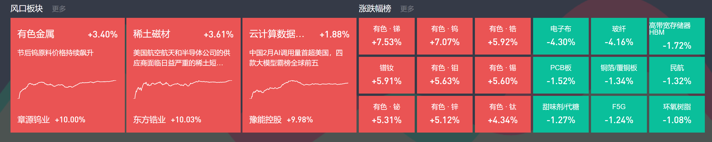 行情回顾 - 市场全天震荡分化,三大指数涨跌互现,沪深京三市约3300股飘红,今日成交2.51万亿[1] - 有色金属板块集体走强,章源钨业、翔鹭钨业等多股涨停[1] - 稀土永磁板块拉升,中稀有色涨停,包钢股份触及涨停[1] - 算力租赁概念活跃,城地香江、利通电子等涨停[1] - 下跌方面,玻纤概念股下挫,国际复材跌近10%[1] 有色金属 - 有色金属板块今日继续大涨,章源钨业、江钨装备、中钨高新、华锡有色等多股涨停[3] - 节后钨原料价格持续飙升,章源钨业因钨原材料价格持续上涨,决定从2026年2月26日起上调焊接机夹刀片产品价格[3][5] - 今日沪锡期货再度大涨,涨幅为8.38%[3] - 章源钨业7天5板,最新价40.60元,涨跌幅+10.00%;江钨装备7天5板,最新价21.53元,涨跌幅+10.02%;中钨高新3天2板,最新价66.22元,涨跌幅+10.00%;华锡有色3天2板,最新价64.76元,涨跌幅+10.01%[5] - 华源证券认为,供给端矿山安全及环保管控趋严导致钨矿阶段性供应紧张,需求端国内需求稳定,PCB刀具需求景气,部分企业一月长单价已上调[6] - 对于锡,国金证券表示,中长期看国内外增量项目稀缺且不确定,需求端有望受益AI赋能及汽车智能化带来的半导体复苏,锡供需格局将长期向好[6] 华为产业链 - 华为产业链表现强势,格尔软件、新炬网络、拓维信息等多股涨停[7] - 催化上,华为云码道公测版于2月26日正式发布,提供集代码大模型、IDE、自主开发模式于一体的智能编码解决方案,覆盖多类AI Coding技术[7] - 同日,DeepSeekV4Lite模型测试效果大幅提升,支持1M上下文+原生多模态,正由华为等芯片厂商测试[7] - 华为董事长梁华表示,已有43个业界主流大模型基于昇腾预训练,200多个开源模型适配昇腾生态,推动6000多个解决方案落地[7] - 格尔软件最新价26.05元,涨跌幅+10.01%;新炬网络最新价33.41元,涨跌幅+10.01%;拓维信息最新价36.52元,涨跌幅+10.00%;普元信息最新价35.50元,涨跌幅+20.01%[8] - 信达证券表示,AI编程重塑核心生产力方式,2024年全球AI代码工具市场价值61亿美元,预计到2030年将达到260亿美元[10] - 申万宏源表示,国产AI模型公司与国产AI芯片企业深度耦合已成趋势,华为昇腾在DeepSeek-V3.2-Exp发布时即实现Day0支持[10] - 中邮证券认为,华为昇腾芯片计划在未来三年推出昇腾950PR/950DT、昇腾960和昇腾970三个系列,以每年算力翻番为目标持续提升性能,其发布的384超节点在多项关键指标上实现对英伟达旗舰产品GB200 NVL72的超越[10] 稀土磁材 - 稀土磁材概念大涨,东方锆业、中稀有色等涨停,包钢股份、北方稀土等跟涨[11] - 据海外媒体报道,美国航空航天和半导体公司的供应商面临日益严重的稀土短缺问题,两家供应商已因此拒绝部分客户订单,短缺集中在钇和钪等小众稀土元素[11] - 半导体研究公司SemiAnalysis指出,美国半导体制造商的钪库存即将告罄,将危及下一代5G芯片生产[11] - 自2025年11月首次报道钇短缺以来,钇价累计上涨60%,较一年前暴涨约69倍[11] - 中信证券认为,2026年起全球稀土供需缺口将持续扩大,2025-2028年全球氧化镨钕供需缺口分别为-0.5/-0.9/-1.3/-2.1万吨[12] - 中诚信国际表示,我国2025年4月对钐、钆、钇等7类中重稀土实施出口管制,推动稀土价格波动上行,2026年轻重稀土价格走势将持续分化[12] - 头豹研究院指出,2025-2027年全球新能源车销量年均增长15-20%,持续拉动镨钕需求,预计2025-2026年稀土价格指数在200-250点震荡上行,氧化镨钕价格中枢回升至60-80万元/吨[12] 其他活跃板块 - 云计算数据中心表现活跃,催化因素为中国2月AI调用量首超美国,四款大模型霸榜全球前五[13] - 智能电网板块活跃,催化因素为北美电力变压器供应缺口达30%[14] - 光伏板块表现活跃[14] - 光通信板块活跃,催化因素为英伟达业绩继续大增[14] - 航天板块活跃,催化因素为2026年我国计划实施2次载人飞行任务,将全力推进登月任务相关配套设施设备建设[14] - 黄金板块活跃,催化因素为黄金期货大涨及老铺黄金等宣布2月底调价[15] - 培育钻石板块活跃,催化因素为Akash Systems宣布已向印度主权云服务商交付全球首批搭载[15] - 锂电池板块活跃,催化因素为津巴布韦暂停锂矿出口[15] - 磷化工板块活跃,催化因素为美国宣布将磷和草甘膦列入战略资源[15] 历史新高公司 - 沃尔德(培育钻石)涨幅20%[16] - 赛恩斯(有色金属)涨幅18.4%[16] - 杰创智能(机器人)涨幅17.71%[16] - 多瑞医药(创新药)涨幅16.22%[16] - 爱迪特(稀土磁材)涨幅14.25%[16] - 聚和材料(半导体)涨幅13.41%[17] - 杰普特(CPO)涨幅13.16%[17] - 江钨装备(有色金属)涨幅10.02%[17] - 翔鹭钨业(有色金属)涨幅10.01%[17] - 烽火通信(光纤+航天)涨幅10.01%[17]