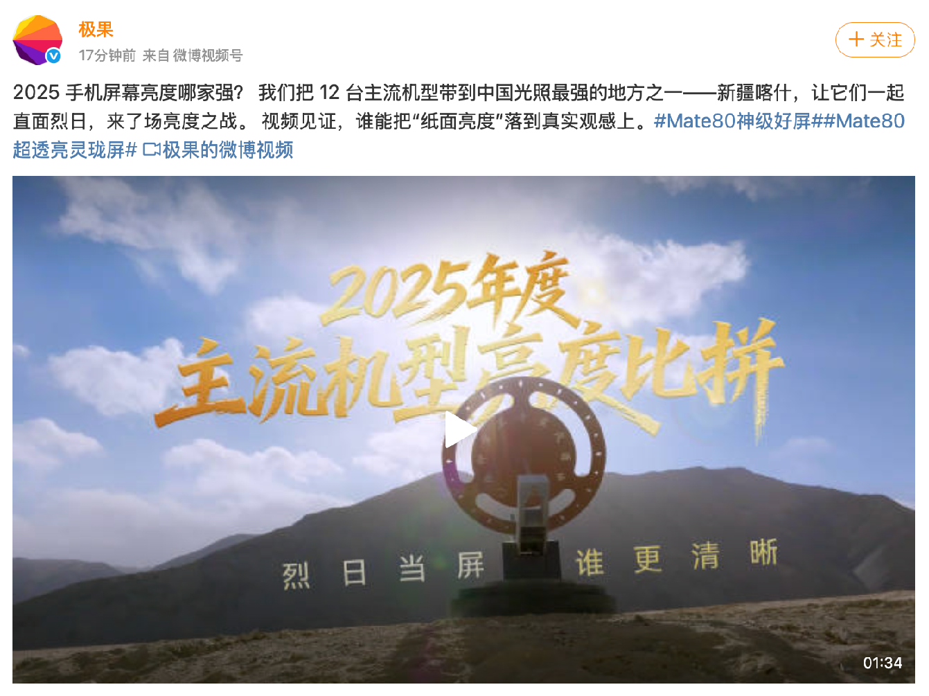 行业技术趋势 - 手机屏幕亮度已成为行业关键竞争参数,厂商正通过户外强光环境下的真实体验测试来展示技术实力 [1] - 2025年主流手机屏幕技术竞争激烈,有媒体在新疆喀什帕米尔高原的户外强光直射下对12款机型进行了对比测试 [1] 公司产品表现 - 华为Mate 80 Pro Max在模拟看图片玩游戏的全局亮度测试以及模拟视频高光的峰值亮度测试中均表现领先,画面通透、细节尽显 [1] - 华为Mate 80系列搭载的“超透亮灵珑屏”采用双层OLED结构,实现了亮度与功耗的双重飞跃 [1] - 该屏幕技术旨在为各种极端光照环境提供清晰舒适的视觉体验 [1]