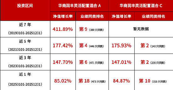 行业整体表现 - 2025年公募基金行业高质量发展效能持续提升,主动权益基金等品种赚钱效应持续释放 [1][11] - 2025年股票型基金和混合型基金的平均净值增长率分别为29.79%和27.38%,持有人的投资体验和获得感得以强化 [1][11] 华商基金公司整体实力 - 华商基金凭借“深度研究、投研一体化”的深耕,涌现出一批长期业绩瞩目的产品 [1][11] - 截至2025年12月31日,华商基金近5年、近7年主动权益类基金和主动固收类基金的绝对收益排名,均在开展同类业务的基金公司中排名前五 [1][11] - 公司坚持高质量发展和主动管理,致力于巩固在投研团队建设、宏观策略判断、行业深度研究等方面的优势,以提升投资者获得感 [8][16] 华商润丰灵活配置混合基金业绩表现 - 该基金是华商基金旗下的主动权益精品,展现出较强的“抗压”能力和持续稳健的业绩积累 [2][12] - **华商润丰灵活配置混合A份额长期业绩**:近1年净值增长率85.02%,近3年147.70%,近5年177.42%,近7年411.89% [3][13] - **华商润丰灵活配置混合C份额长期业绩**:近1年净值增长率84.87%,近3年147.01%,近5年175.93% [3][13] - **华商润丰灵活配置混合A份额年度业绩**:2019年至2025年净值增长率分别为16.03%、59.02%、8.69%、3.05%、0.74%、32.90%、85.02% [2][5][12][13] - **华商润丰灵活配置混合C份额年度业绩**:2019年至2025年净值增长率分别为6.50%、58.78%、8.52%、2.94%、0.64%、32.77%、84.87% [5][13] 华商润丰灵活配置混合基金排名情况 - **A份额同类排名**:近7年在380只同类中排名第9,近5年在445只同类中排名第4,近3年在471只同类中排名第6,近1年在473只同类中排名第18 [3][13] - **C份额同类排名**:近5年在143只同类中排名第2,近3年在235只同类中排名第2,近1年在316只同类中排名第10 [3][13] - 基金评价机构数据显示,华商润丰灵活配置混合A近3年、近5年、近7年业绩均位列同类第十 [1][11] 基金经理与投资策略 - 华商润丰灵活配置混合基金由华商基金多资产投资总监胡中原掌舵 [5][13] - 胡中原职业生涯始于2014年,2019年3月开始管理该基金,已成长为一名表现出强大多资产驾驭能力的全能型基金经理 [5][13] - 其投资哲学以风险收益比为第一要义,权益投资体系以中观行业比较为核心 [7][15] - 行业选择主要看主观性价比和行业趋势,避免持仓过度集中;个股选择侧重产业链各环节龙头均衡配置,淡化阿尔法 [7][15] - 投资决策只关注行业本身,当持仓行业出现证伪信号或发现更高性价比方向时,会果断进行切换 [7][15]