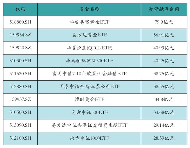 市场概况 - 10月30日两市ETF两融余额为1182.84亿元,较前一交易日减少32.5亿元 [1] - 其中融资余额为1100.5亿元,较前一交易日减少31.93亿元,融券余额为82.34亿元,较前一交易日减少5795.47万元 [1] - 沪市ETF两融余额为824.62亿元,较前一交易日减少25.32亿元,深市ETF两融余额为358.22亿元,较前一交易日减少7.19亿元 [1] ETF融资融券余额排名 - 华安易富黄金ETF以81.81亿元的融资融券余额位居首位 [2] - 易方达黄金ETF和华夏恒生(QDII-ETF)分别以57.22亿元和41.16亿元的余额位列第二、三位 [2] - 前十大ETF两融余额榜单中包含多只宽基指数ETF(如华泰柏瑞沪深300ETF、南方中证500ETF)和行业主题ETF(如国泰中证全指证券公司ETF) [2] ETF融资买入额排名 - 华泰柏瑞南方东英恒生科技指数(QDII-ETF)和易方达中证香港证券投资主题ETF融资买入额最高,分别为20.15亿元和20.08亿元 [3][4] - 海富通中证短融ETF以17.03亿元的融资买入额位列第三 [3][4] - 融资买入活跃的ETF主要集中在港股科技主题、黄金以及固定收益类产品 [4] ETF融资净买入额排名 - 华安创业板50ETF融资净买入额最高,为1.14亿元 [5][6] - 易方达沪深300医药卫生ETF和华宝中证全指证券公司ETF融资净买入额分别为6230.7万元和4992.39万元,位列第二、三位 [5][6] - 融资净买入榜单显示资金对创业板、医药卫生、证券公司以及海外互联网等板块有积极配置意向 [6] ETF融券卖出额排名 - 华夏上证50ETF融券卖出额最高,为3251.05万元 [7][8] - 华泰柏瑞沪深300ETF和南方中证500ETF融券卖出额分别为2260.88万元和1832.34万元 [7][8] - 融券卖出活动主要集中于大盘宽基指数ETF,如上证50、沪深300和中证500ETF [8]