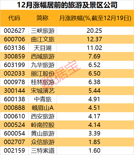 | | 12月涨幅居前的旅游及景区公司 | | | --- | --- | --- | | 代码 | 简称 | 月涨跌幅(%,截至12月19日) | | 002627 | 三峡旅游 | 20.25 | | 600706 | 曲江文旅 | 12.37 | | 603136 | 天目湖 | 11.02 | | 300859 | 西域旅游 | 7.69 | | 603199 | 九华旅游 | 6.52 | | 002033 | 丽江股份 | 6.50 | | 000978 | 桂林旅游 | 6.38 | | 300144 | 宋城演艺 | 5.44 | | 600138 | 中青旅 | 4.91 | | 000888 | 峨眉山A | 4.51 | | 000610 | 西安旅游 | 4.17 | | 000524 | 岭南控股 | 4.14 | | 600054 | 黄山旅游 | 3.39 | | 002707 | 众信旅游 | 1.85 | | 002159 | 三特索道 | 1.60 | 人民财讯12月20日电,元旦小长假将至,旅游市场显著升温。近期,同程旅行平台关于"跨年""元旦"等 关键词搜索热度环比大增 ...
