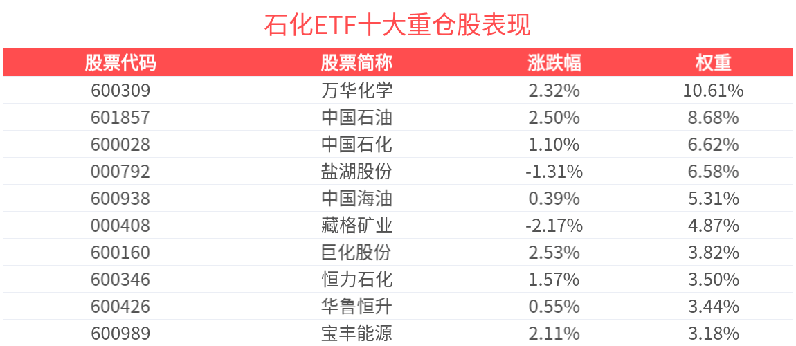 石化ETF紧密跟踪中证石化产业指数,数据显示,截至2025年12月31日,中证石化产业指数前十大权重股分别为万华化学、中国石油、中国石化、盐湖股 份、中国海油、藏格矿业、巨化股份、恒力石化、华鲁恒升、宝丰能源,前十大权重股合计占比56.73%。 | 股票代码 | 股票简称 | 涨跌幅 | 权重 | | --- | --- | --- | --- | | 600309 | 万华化学 | 2.32% | 10.61% | | 601857 | 中国石油 | 2.50% | 8.68% | | 600028 | 中国石化 | 1.10% | 6.62% | | 000792 | 盐湖股份 | -1.31% | 6.58% | | 600938 | 甲国海海 | 0.39% | 5.31% | | 000408 | 藏格矿业 | -2.17% | 4.87% | | 600160 | 巨化股份 | 2.53% | 3.82% | | 600346 | 恒力石化 | 1.57% | 3.50% | | 600426 | 华鲁恒升 | 0.55% | 3.44% | | 600989 | 宝幸能源 | 2.11% | 3 ...