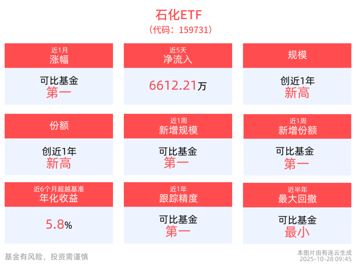 截至2025年11月3日9:56,中证石化产业指数上涨0.08%,成分股中国海油、中国石油、宝丰能源、广东宏大、浙江龙盛等领涨。石化ETF(159731)上涨 0.25%,最新价报0.8元。从资金净流入方面来看,石化ETF近6天获得连续资金净流入,合计"吸金"1亿元。份额方面,石化ETF最新份额达1.86亿份,创近1 年新高。规模方面,石化ETF最新规模达1.49亿元,创近1年新高。 回撤方面,截至2025年10月31日,石化ETF近半年最大回撤6.47%,相对基准回撤0.14%,在可比基金中回撤最小。 跟踪精度方面,截至2025年10月31日,石化ETF近1年跟踪误差为0.037%,在可比基金中跟踪精度最高。 石化ETF(159731)紧密跟踪中证石化产业指数,数据显示,截至2025年10月31日,中证石化产业指数前十大权重股分别为万华化学、中国石油、盐湖股份、 中国石化、中国海油、巨化股份、藏格矿业、金发科技、宝丰能源和华鲁恒升,前十大权重股合计占比56.05%。 石化ETF(159731),场外联接(华夏中证石化产业ETF发起式联接A:017855;华夏中证石化产业ETF发起式联接C:017856)。 ...