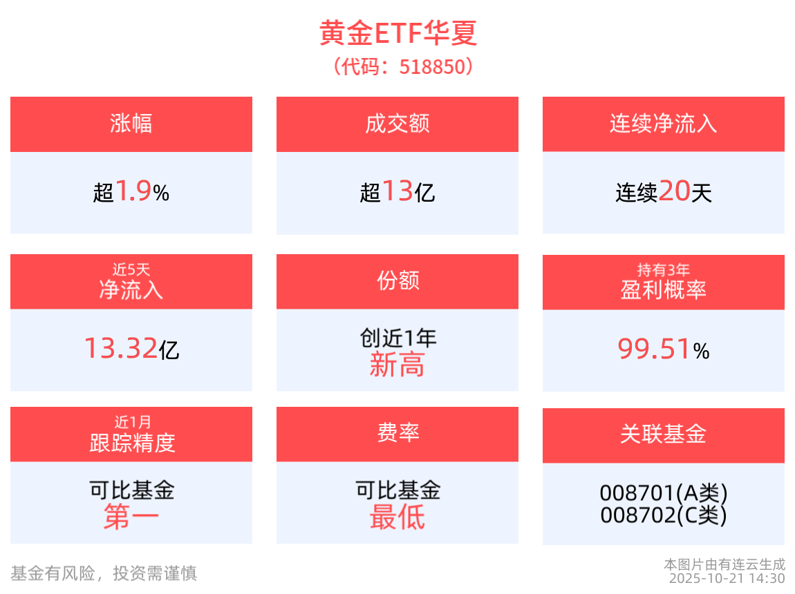涨超1.9%,黄金ETF华夏(518850)连续20天净流入