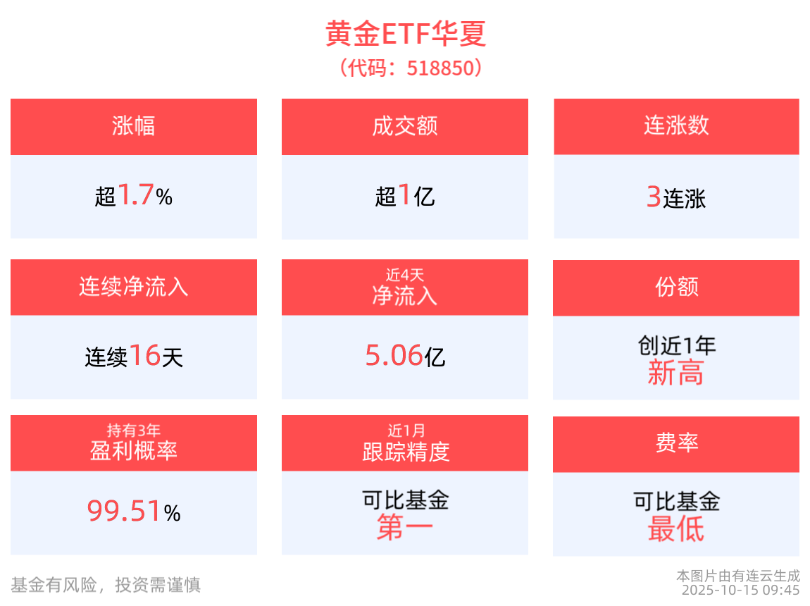 强势领涨两市,黄金ETF华夏(518850)冲击3连涨,年内涨幅达54.53%