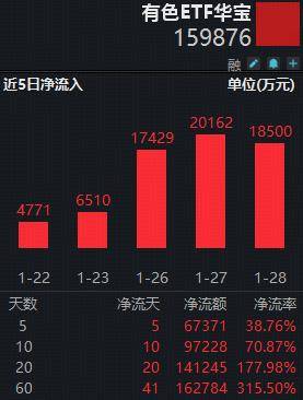 昨日(1月28日)有色金属板块领涨两市,白银有色、湖南黄金、中国铝业等16只成份股涨停,有色ETF华宝(159876)场内价格飙涨6.95%,续创历史新 高!深交所数据显示,该ETF单日吸金1.85亿元,拉长时间来看,此前20日连续吸金,合计狂揽超14亿元! 值得一提的是,今日(1月29日)盘中现货黄金首次突破5500美元大关,本周金价从略低于5000美元的水平一路狂飙,连破6道整百关口,周涨幅超500美 元。 消息面上,北京时间周四(1月29日)凌晨,美联储结束为期两天的货币政策会议,宣布将联邦基金利率目标区间维持在3.5%至3.75%之间,符合市场普遍 预期。美联储暂停降息但释放未来宽松预期,叠加市场对鸽派美联储主席人选的押注,推动贵金属避险及抗通胀属性凸显。 中信建投证券认为,只要美联储还处于降息通道中,有色金属价格仍有上涨动力。东方证券指出,美联储降息周期里,供需偏紧的实物资产,即使是较小的 供需缺口也有望产生较大的价格弹性。本轮降息周期下,以铜、铝为代表的工业金属超级周期或已来临。 提醒:近期市场波动可能较大,短期涨跌幅不预示未来表现。请投资者务必根据自身的资金状况和风险承受能力理性投资,高度注意仓 ...