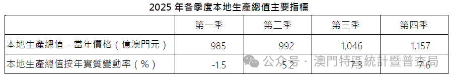澳门2025年第四季度及全年宏观经济表现 - 2025年第四季度澳门本地生产总值修订数值为1,157.2亿澳门元,同比实质增长7.6%,经济总量恢复至2019年同期的94.1% [1] - 2025年全年澳门本地生产总值修订数值为4,180.4亿澳门元,同比实质增长4.7%,经济总量恢复至2019年的89.6% [1] - 2025年全年人均本地生产总值为60.7万澳门元,同比增长4.3% [1] 经济增长驱动因素:服务出口 - 2025年第四季度入境旅客同比上升15.4%,带动服务出口录得9.8%的同比增幅 [1] - 在服务出口中,博彩服务出口增长强劲,同比增幅达18.0% [1] - 其他旅游服务出口亦录得增长,同比增幅为3.7% [1] 内部需求表现 - 2025年第四季度政府最终消费支出同比上升2.1%,私人消费支出同比上升0.7% [1] - 2025年第四季度固定资本形成总额录得1.3%的同比升幅 [1] - 2025年全年政府最终消费支出及私人消费支出分别上升3.0%及1.3%,但固定资本形成总额则下跌7.8% [1] 各季度经济数据概览 - 2025年第一季度本地生产总值(当年价格)为685亿澳门元 [2] - 2025年第二季度本地生产总值(当年价格)为992亿澳门元 [2] - 2025年第三季度本地生产总值(当年价格)为1,046亿澳门元 [2] - 2025年第四季度本地生产总值(当年价格)为1,157亿澳门元 [2]