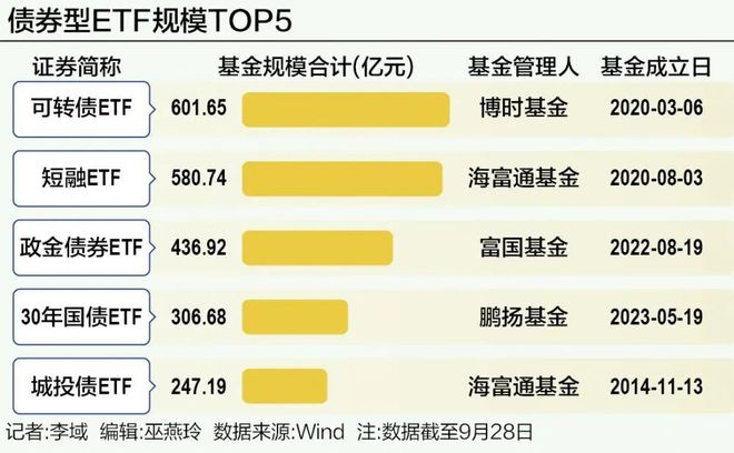随着市场持续扩容,百亿级债券ETF产品不断涌现。截至9月末,规模超过百亿元的债券ETF产品已达32只。其中,海富通 短融ETF以631.5亿元规模领跑市场,博时可转债ETF紧随其后,规模达到605.73亿元,两只产品均突破600亿元大关。 【环球网财经综合报道】今年以来,债券ETF成为ETF领域增长最为迅猛的资产类别之一。Wind数据显示,截至9月末,债 券ETF总规模达6950.54亿元,距离突破7000亿元大关仅一步之遥,较年初增长超过5000亿元,增幅近300%,稳居年内规模 增长最快的ETF品类首位。 这一增长态势并非偶然。自2022年末以来,债券型ETF已连续三年实现跨越式发展。2022年规模从239.64亿元快速攀升至 529.43亿元,增幅达121%;2023年末突破800亿元重要关口;2024年5月首次突破千亿元大关,年末规模达到1739.73亿元。 进入2025年后,债券ETF增速进一步加快,2月规模突破2000亿元,7月跨越5000亿元里程碑,9月成功站上6000亿元台阶, 展现出强劲的发展势头。 值得注意的是,科创债ETF正在重塑债券ETF的市场格局。截至9月30日,存续的科创债ETF累 ...