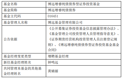 | 基金名称 | 博远增睿纯债债券型证券投资基金 | | --- | --- | | 基金简称 | 博远增容纯债债券 | | 基金主代码 | 016451 | | 基金管理人名称 | 博远基金管理有限公司 | | 公告依据 | 《公开募集证券投资基金信息披露管理办法》 | | | 《基金管理公司投资管理人员管理指导意见》、 | | | 《证券期货经营机构投资管理人员注册登记规 | | | 则》、《博远增睿纯债债券型证券投资基金基金 | | | 合同》 | | 基金经理变更类型 | 增聘基金经理 | | 新任基金经理姓名 | 钟鸣远 | | 共同管理本基金的其他基 | 黄婧丽 | | 金经理姓名 | | (责任编辑:康博) 中国经济网北京10月20日讯 近日,博远基金公告,博远增睿纯债债券增聘钟鸣远。 钟鸣远现任博远基金管理有限公司总经理。历任国家开发银行深圳分行资金计划部职员,联合证券 有限责任公司固定收益部投资经理,泰康人寿保险股份有限公司固定收益策略研究员,新华资产管理股 份有限公司固定收益部高级投资经理,易方达基金管理有限公司固定收益总部总经理兼固定收益投资部 总经理,大成基金管理有限公司副总经理。20 ...