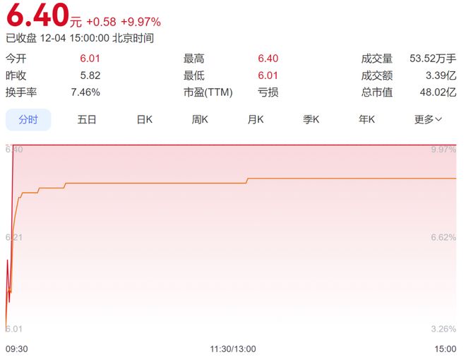 12月3日,机器人概念股日发精机公告称,全资子公司日发精机(香港)有限公司(以下简称"日发香 港")拟以1欧元的价格将持有的意大利Machining Centers Manufacturing S.p.A(以下简称"意大利 MCM")100%股权转让给Special Situations S.r.l.(以下简称"SSS公司")。 据了解,意大利MCM已连续亏损多年,截至2025年8月31日,其净资产为-1.43亿元,已资不抵债。交 易完成后,日发精机将因前期911.68万欧元的日常经营性借款被动形成对合并报表外主体的财务资助, 该款项已纳入意大利MCM的企业危机和解协商(C.N.C)程序,存在无法收回的风险。 12月4日,日发精机开盘后表现强势,封涨停,报6.40元/股。 | 今开 | 6.01 | | 最高 | 6.40 | | 成交量 | 53.52万手 | | --- | --- | --- | --- | --- | --- | --- | --- | | 昨收 | 5.82 | | 最低 | 6.01 | | 成交额 | 3.39亿 | | 换手率 | 7.46% | | 市盈(TTM) | 亏损 ...