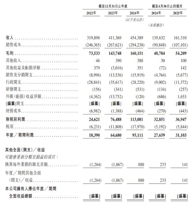 据悉,该公司是一家专注于非洲、拉美、中亚等地快速发展新兴市场的跨国卫生用品公司,主要从事婴 儿纸尿裤、婴儿拉拉裤、卫生巾和湿巾等婴儿及女性卫生用品的开发、制造和销售。于往绩记录期间, 该公司的大部分收入来自向非洲客户的销售。根据弗若斯特沙利文的资料,以2024年销量计算,公司在 非洲婴儿纸尿裤和卫生巾市场均排名第一,市场份额分别为20.3%及15.6%;及以2024年收入计算,公司 在非洲婴儿纸尿裤市场和卫生巾市场均排名第二,市场份额分别为17.2%及11.9%。 于往绩记录期间,该公司的收入及净利润取得显著增长。收入由2022年的3.2亿美元大幅增加28.6%至 2023年的4.114亿美元,并由2023年的4.114亿美元增加10.5%至2024年的4.544亿美元,另外亦由截至 2024年4月30日止四个月的1.396亿美元增加15.5%至截至2025年4月30日止四个月的1.613亿美元。净利 润由2022年的1840万美元大幅增加251.7%至2023年的6470万美元,并由2023年的6470万美元增加47.0% 至2024年的9510万美元,另外亦由截至2024年4月30日止四个月的2770万美 ...