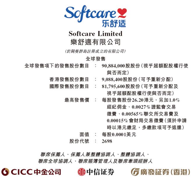 | 全球發售項下的發售股份數目 | : 90,884,000 股股份(視乎超額配股權行使 | | --- | --- | | 與否而定) | | | 香港發售股份數目 : | 9.088.400股股份(可予重新分配) | | 國際發售股份數目 | : 81.795.600股股份(可予重新分配及 | | | 視乎超額配股權行使與否而定) | | 最高發售價 : 每股發售股份26.20港元,另加1.0% | | | | 經紀佣金、0.0027%證監曾交易 | | | 徵費 · 0.00565%聯交所交易費及 | | | 0.00015%會財局交易徵費(須於申請 | | | 時以港元繳足,多繳款項可予退還) | | 面值 : 每股0.0001美元 | | | 股份代號 : 2698 | | 来源:瑞恩资本RyanbenCapital | 乐舒适(02698.HK)基石投资者 | | | | --- | --- | --- | | 基石投资者 | | 认购金额 | | | | (万美元) | | BA Sprout Limited | BA Capital, 何愚緣控制 | 1,500.00 | | BA HM Li ...