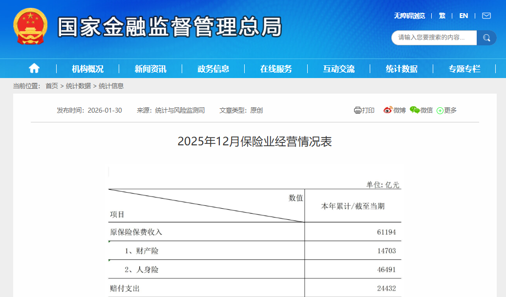 2025年保险业原保费收入6.12万亿元,同比增长7.43%