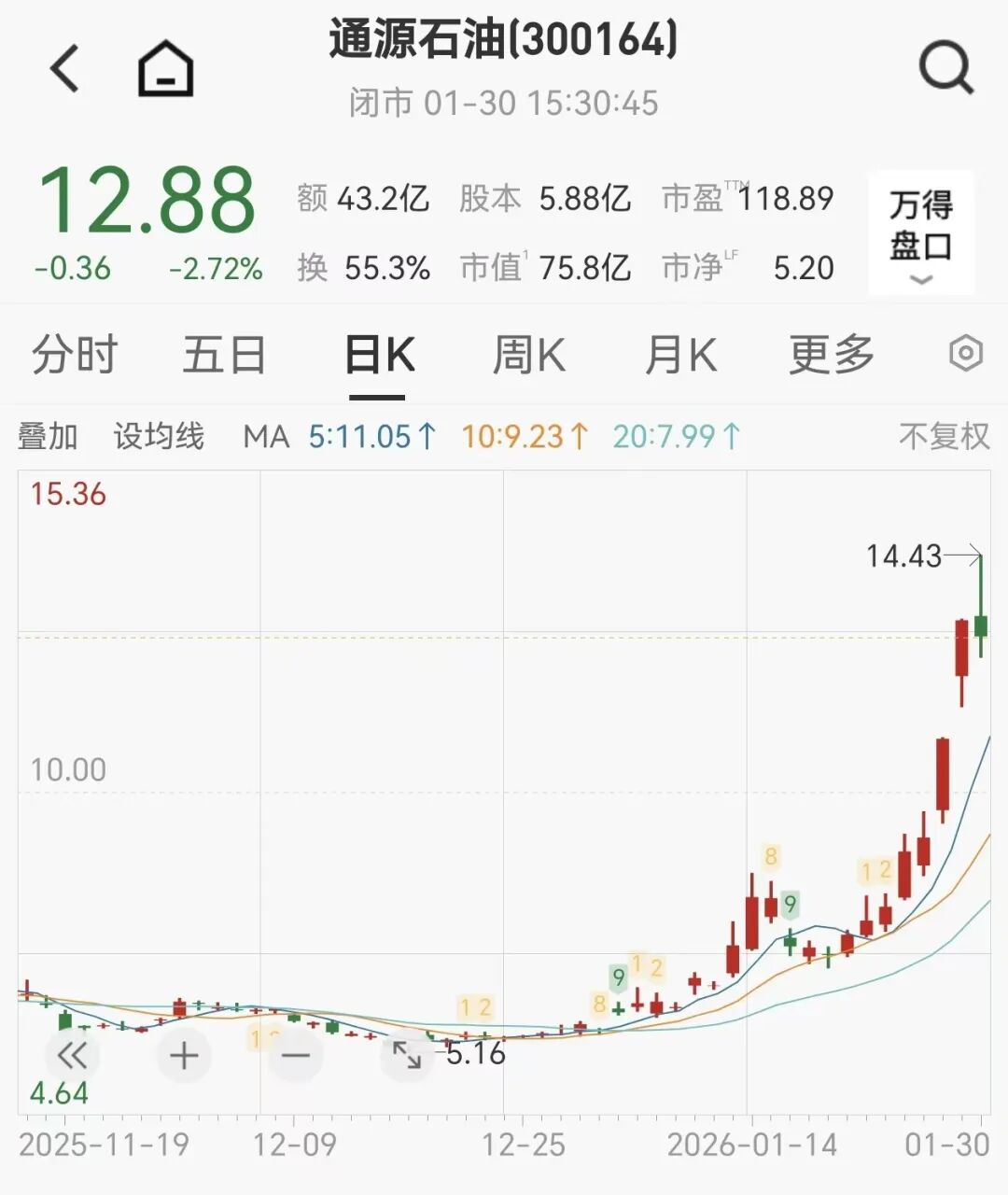地缘局势与油价上涨 - 地缘因素扰动推涨油价,连带石油基金和概念股强势上涨 [1] - 今年以来,委内瑞拉、伊朗等地缘紧张局势引发市场供应风险担忧,叠加寒潮天气,国际油价一路飙升 [6] - 近期资金在油市的推涨情绪明显增加,地缘与宏观相互叠加推升油价,但基本面并未出现实质性利好 [6] 石油石化行业表现 - 以申万一级行业为例,石油石化行业单周大涨近8% [6] - 具体到二级行业,油服工程单周涨近15% [6] - 本周A股最牛股是石油股 [2] 龙头公司通源石油表现 - 通源石油周内走出“20CM”二连板,单周涨超63%,成为本期最牛股 [3] - 公司年初以来股价一路上行,1月份股价已翻倍,累计上涨超133% [3] - 公司股票在2026年1月26日至28日连续三个交易日收盘价格涨幅偏离值累计超过30%,属于异常波动情形 [6] - 公司所属行业为石油和天然气开采专业及辅助性活动行业,行业发展与国际原油价格、油公司资本开支等因素密切相关 [6] 原油LOF基金溢价风险 - 易方达原油LOF二级市场交易价格明显高于基金份额净值,2026年1月28日基金份额净值为1.1514元,1月30日收盘价为1.340元 [4] - 广发石油LOF、华安石油基金LOF、嘉实原油LOF均出现二级市场交易价格大幅溢价 [4] - 多家基金公司采取停牌或提示可能申请停牌等措施向市场警示风险 [4] 其他表现突出的个股 - **湖南黄金**:周涨幅61.08%,公司拟收购湖南黄金天岳矿业有限公司100%股权及湖南中南黄金冶炼有限公司100%股权 [7] - **中国黄金**:周涨幅59.22%,公司发布异动公告,未拥有探矿权、采矿权,预计2025年净利润同比下降55%~65% [7] - **晓程科技**:周涨幅53.13%,公司公告2025年净利同比预增93%-179%,黄金产量、销量及国际金价均同比增加 [7] - **天地在线**:周涨幅51.23%,为AI应用概念,5天4板,公司专注于提供互联网综合营销服务及企业级SaaS营销服务 [7] - **斯迪克**:周涨幅61.08%,公司主要从事功能性薄膜材料、电子级胶粘材料等产品的研发、生产和销售 [7] - **中微半导**:周涨幅36.57%,公司决定对MCU、Nor Flash等产品进行价格调整,涨价幅度15%-50% [7]