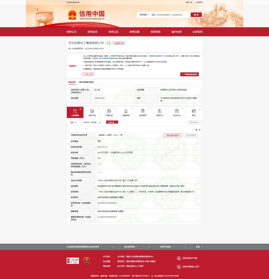 公司基本情况 - 公司全称为河北田原化工集团有限公司 是一家位于保定市的民营化肥生产企业 [3] - 公司成立于2000年 注册资本为27666万元人民币 法定代表人为张江涛 [4] - 公司占地面积1200余亩 参控股公司4家 总资产约10亿元 在册员工700余人 [3] - 公司主要产品年产能为合成氨25万吨 尿素30万吨 甲醇7万吨 双氧水10万吨 年产值约10亿元 [3] 行政处罚事件 - 公司于11月27日收到保定市曲阳县应急管理局(地震局)开出的行政处罚罚单 [1] - 违法事实为合成氨系统节能升级设备更新改造项目的安全设施设计未按规定报审 擅自施工建设 [1] - 违法行为类型依据《中华人民共和国安全生产法》第三十三条第二款 [1] - 处罚机关依据《中华人民共和国安全生产法》第九十八条第(二)项及《应急管理行政处罚裁量权基准》第29条裁量阶次C进行处罚 [1] - 处罚结果为对公司处以45万元罚款 对主要负责人处以4.5万元罚款 [1] - 行政处罚决定书文号为﹝冀保曲﹞应急罚﹝2025﹞7号 [1]
