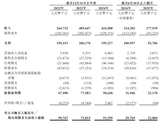 近日,据港交所披露,南京海纳医药科技股份有限公司(海纳医药)向港交所主板提交上市申请书,中金 公司(601995)为其独家保荐人。 | | | 截至12月31日止年度 | | 截至6月30日止六個月 | | | --- | --- | --- | --- | --- | --- | | | 2022年 | 2023年 | 2024年 | 2024年 | 2025年 | | | 人民幣千元 | 人民幣千元 | 人民幣于元 | 人民幣千元 | 人民幣于元 | | | | | | (未經審核) | | | 收入 | 264,732 | 409,647 | 424,588 | 214,302 | 177,939 | | 销售成本 | (105.581) | (203.477) | (229,371) | (113,345) | (85.233) | | 毛利 | 159.151 | 206,170 | 195,217 | 100,957 | 92.706 | | 其他收入及收益 | 2.930 | 5.335 | 6.403 | 2.739 | 3.073 | | 销售及分销開支 | (21,873) | (27.2 ...