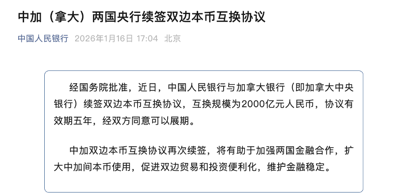 【导读】中加两国央行续签双边本币互换协议,互换规模为2000亿元人民币 中国基金报记者 晨曦 1月16日,中国人民银行官网消息显示,中加(拿大)两国央行续签双边本币互换协议。 经国务院批准,近日, 中国人民银行与加拿大银行(即加拿大中央银行)续签双边本币互换 协议,互换规模为2000亿元人民币,协议有效期五年,经双方同意可以展期。 中国人民银行官网数据显示,2025年,中国人民银行与韩国银行、冰岛中央银行、欧洲中央 银行、瑞士国家银行、匈牙利国家银行、新西兰储备银行、泰国银行、土耳其中央银行、巴 西央行、印度尼西亚银行、斯里兰卡中央银行等续签双边本币互换协议。 2025年10月,中国人民银行宏观审慎管理局负责人在接受采访时表示,目前中国人民银行已 与欧央行及新西兰、韩国、印尼、巴西、沙特等国家和地区的央行或货币当局签署有效互换 协议32份,基本覆盖全球六大洲重点地区的主要经济体,规模约4.5万亿元人民币。未来,中 国人民银行将有序扩大货币互换合作覆盖面,重点是与我国经贸往来密切的国家和地区加深 合作,有效使用互换资金,增加流动性供给,促进贸易投资便利化。 《2025年第三季度中国货币政策执行报告》中提到,稳步 ...