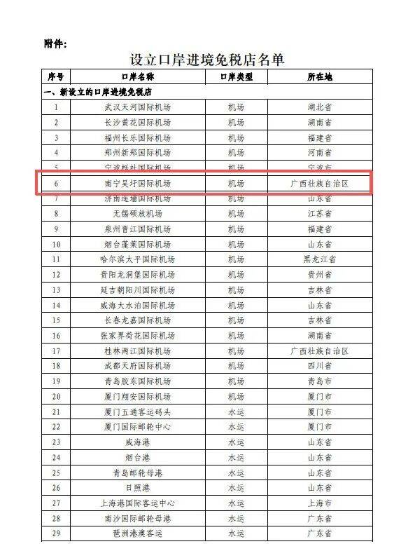 政策核心内容 - 财政部等五部委联合印发通知,在武汉天河国际机场等41个口岸各新设1家口岸进境免税店,大幅增加口岸进境免税店数量 [1] - 政策旨在便利进境旅客免税购物消费,发挥免税店支持提振消费的作用,促进免税商品零售业务健康有序发展 [1] - 口岸进境免税店是设立在对外开放的机场、水运或陆路口岸隔离区内,向进境旅客销售免税商品的商店 [1] 南宁吴圩国际机场的具体规划与影响 - 南宁吴圩国际机场入选新设立的口岸进境免税店名单,标志着其商业业态将实现重要升级,服务链条得到全面延伸 [1] - 进境免税店将与现有出境免税店、离境退税服务形成互补,构建“进境+出境”全流程免税购物体系,打造“沉浸式、一站式”消费体验 [1] - 此举旨在提升机场枢纽吸引力与竞争力 [1] - 机场将加快推进进境免税店招商工作,精准遴选免税行业头部运营商 [2] - 同步优化现有出境免税业态布局,重点引入国产潮牌及广西本土特色产品,打造独具区域辨识度的消费场景 [2] - 机场T3航站楼建设稳步推进,预计2027年实现投运,航站楼内规划超千平方米免税业态面积,助力机场免税商业能级大幅跃升 [2] - 未来目标是全力打造全国机场免税商业新标杆,为消费者带来更高品质购物体验 [2] 新设立口岸进境免税店名单概览 - 新设立的口岸进境免税店共计41家,覆盖机场、水运和陆路口岸 [3][4] - 机场口岸包括武汉天河、长沙黄花、福州长乐、郑州新郑、南宁吴圩、济南遥墙、无锡硕放、泉州晋江、烟台蓬莱、哈尔滨太平、贵阳龙洞堡、延吉朝阳川、威海大水泊、长春龙嘉、张家界荷花、桂林两江、成都天府、青岛胶东、厦门翔安等 [3] - 水运口岸包括厦门五通客运码头、厦门国际邮轮中心、威海港、烟台港、青岛邮轮母港、日照港、上海港国际客运中心、南沙国际邮轮母港、琶洲港澳客运等 [3] - 陆路口岸包括深圳湾、二连浩特公路、满洲里公路、绥芬河公路、甘其毛都、珲春公路、东宁、绥芬河铁路、青茂、黑河(步行)等 [4] 继续设立的口岸进境免税店名单 - 继续设立的口岸进境免税店包括海口美兰国际机场、揭阳潮汕国际机场等机场口岸 [4] - 水运口岸包括蛇口邮轮中心、中山港、九州港、南沙港、深圳机场福永码头等 [4] - 陆路口岸包括深圳的罗湖、皇岗、文锦渡等 [4]