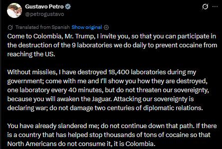 事件概述 - 美国总统特朗普声称哥伦比亚可能因毒品问题而"遭受攻击" [1] - 哥伦比亚总统佩特罗回击称"侵犯我们的主权即宣战" [1] 哥伦比亚政府的行动与立场 - 哥伦比亚政府已捣毁1.84万个制毒窝点 [3] - 哥伦比亚每天摧毁9个制毒窝点 [3] - 哥伦比亚拦截了数千吨流向美国的可卡因 [3] - 佩特罗邀请特朗普亲自见证哥伦比亚的禁毒行动 [3] 美方言论与指控 - 特朗普指控哥伦比亚境内的制毒窝点制造可卡因并销往美国 [3] - 特朗普表示任何向美国"贩毒"的国家都将"遭受攻击" [3] - 佩特罗认为美方此前关于他本人的言论构成诽谤 [3]