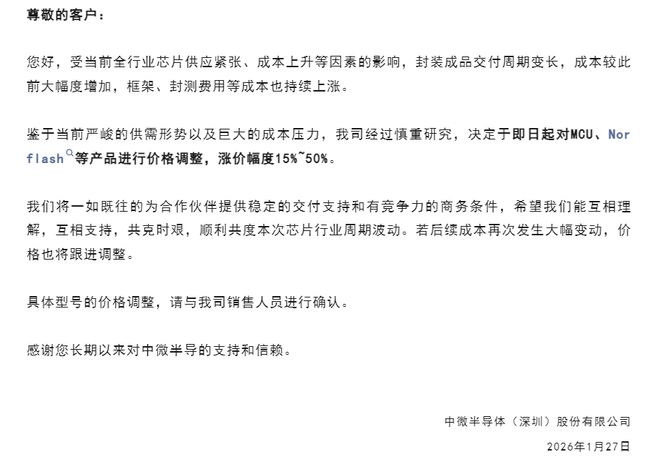 两家半导体公司宣布芯片涨价。 1月27日晚间,中微半导(688380.SH)在官方微信号发布了涨价函,表示鉴于当前严峻的供需形势以及巨大的成本压力,经过慎重研究,决定于即日起 对MCU、Nor flash等产品进行价格调整,涨价幅度为15%至50%。 对于涨价原因,中微半导表示,受当前全行业芯片供应紧张、成本上升等因素的影响,封装成品交付周期变长,成本较此前大幅度增加,框架、封测费用 等成本也持续上涨。 中微半导还强调,如果后续成本再次发生大幅变动,价格也将跟进调整。 中微半导体(深圳)股份有限公司是一家以微控制器(MCU)研发与设计为核心的平台型芯片设计公司,为消费电子、智能家电、工业控制及汽车电子 等领域提供芯片级一站式整体解决方案。 截至27日收盘,中微半导股价报45.71元/股,最新市值为183亿元。 另外,据上海证券报报道,国科微(300672.SZ)已对客户发出涨价函,宣布自1月起对合封512Mb的KGD(已知合格芯片)产品涨价40%,对合封1Gb的 KGD产品涨价60%,对合封2Gb的KGD涨价80%,对外挂DDR的产品价格另行通知。 中微半导近日公告显示其业绩爆发,预计2025年归属于上市公司 ...