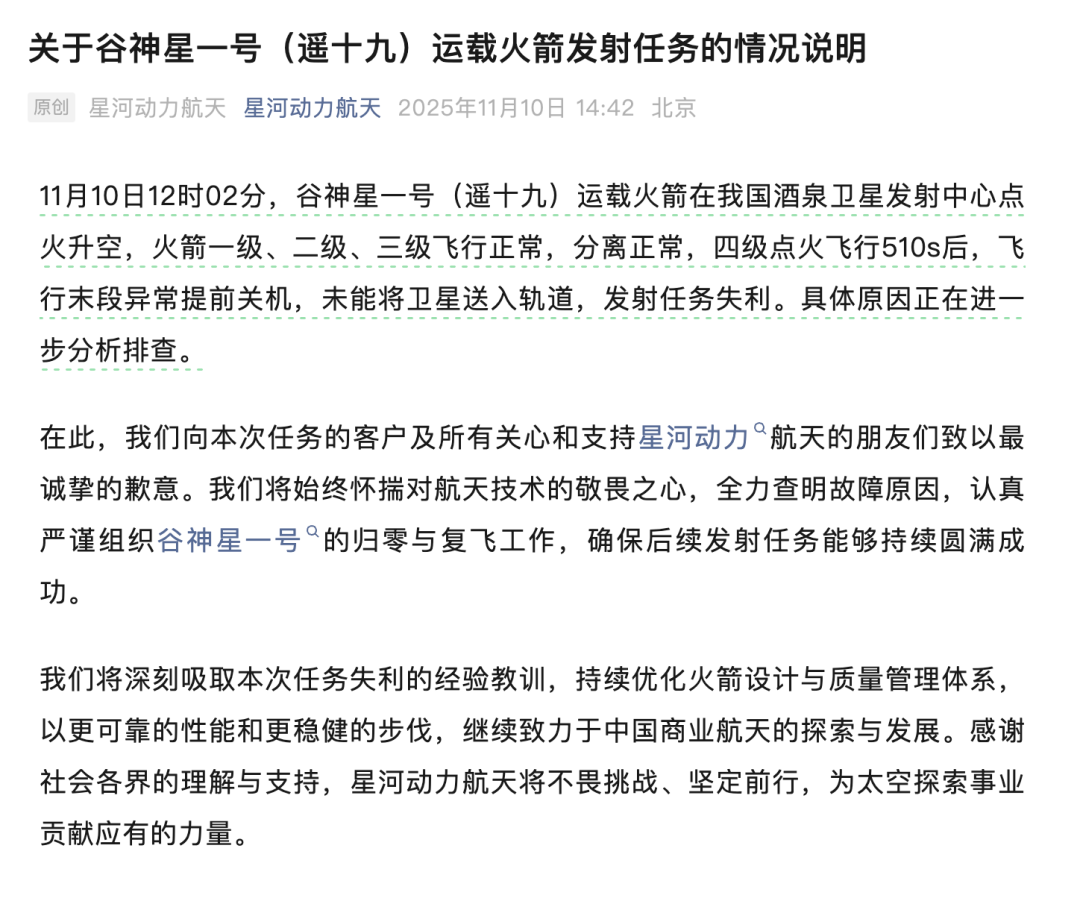 2025.11. 10 本文字数:474,阅读时长大约4分钟 据新华社,11月10日12时02分,我国在酒泉卫星发射中心使用谷神星一号民营商业运载火箭发射吉 星高分04C星,并搭载发射吉星平台02A04星、中北大学一号卫星,火箭飞行异常,卫星未能进入 预定轨道,发射任务失利。具体原因正在进一步分析排查。 微信编辑 | 雨林 第 一 财 经 持 续 追 踪 财 经 热 点 。 若 您 掌 握 公 司 动 态 、 行 业 趋 势 、 金 融 事 件 等 有 价 值 的 线 索 , 欢 迎 提 供 。 专 用 邮 箱 : bianjibu@yicai.com 来源:新华社、星河动力航天 10日中午,星河动力航天也发布了情况说明: 11月10日12时02分,谷神星一号(遥十九)运载火箭在我国酒泉卫星发射中心点火升空,火箭一 级、二级、三级飞行正常,分离正常,四级点火飞行510s后,飞行末段异常提前关机,未能将卫星 送入轨道,发射任务失利。具体原因正在进一步分析排查。 星河动力航天表示,将全力查明故障原因,认真严谨组织谷神星一号的归零与复飞工作,确保后续发 射任务能够持续圆满成功。 (注:我们会对线索进行核实。您的隐私 ...