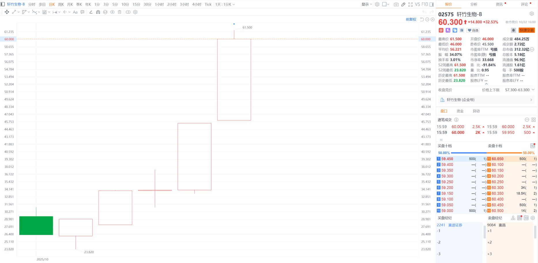 港股异动丨轩竹生物逆势大涨35%创新高 上市六日股价较发行价已累涨超4倍 市值超300亿