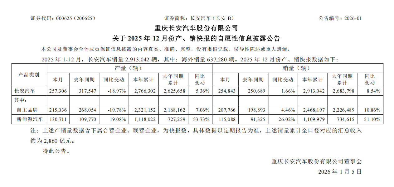 1月4日晚间,重庆长安汽车股份有限公司(下称长安汽车)发布2025年12月产、销快报。数据显示,当月,长安汽车产、销量为分别为25.7306万辆、 25.4843万辆。 此外,公告披露了2025年1-12月数据。2025年,长安汽车累计产量为276.6302万辆,同比增长5.36%,累计销量为291.3042万辆,同比增长8.54%。 值得注意的是,2025年,长安新能源汽车销量突破百万辆,达110.9979万辆,同比大幅增长51.10%,阿维塔、深蓝、启源三大新能源品牌海外销量再创佳 绩,达63.7万辆,同比增长18.9%;自主品牌销量246.8197万辆,同比增长10.86%。(肖瑜媛) | 产品类别 | | 产量(辆) | | | | | | 销量(辆) | | | | --- | --- | --- | --- | --- | --- | --- | --- | --- | --- | --- | | 本月 | 去年同期 | 同比变动 | 本年累计 | 去年同期 累计 | 同比 变动 | 本月 | 去年同期 | 同比变动 | 本年累计 | 去年 第 | | 长安汽车 257,306 | 317,547 ...