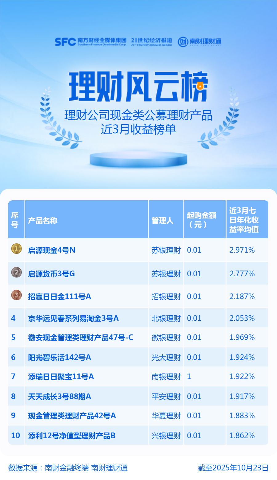 数据说明: 产品统计范围为理财公司发行的公募现金类产品,统计截止日期为2025年10月23日,统计区间为近3个月。 榜单排名来自理财通AI全自动化实时排名,如您对数据有疑问,请在文末联系助理进一步核实。 一、整体表现 車集团 21世纪经济报道 理财公司现金类公募理财 近3月收益榜单 | 10 पुर | 产品名称 | 管理人 | 起购金额 (元) | 近3月七 日年化收 | | --- | --- | --- | --- | --- | | | | | | 益率均值 | | | 启源现金4号N | 苏银理财 | 0.01 | 2.971% | | | 启源货币3号G | 苏银理财 | 0.01 | 2.777% | | | THE REDULEA | 招银聘财 0.01 | | 2.187% | | 4 | 京约可用 : 371 : 35 A | 北線建訓 | 0.01 | 2.053% | | 5 | 徽安现金管理类理财产品47号-C | 徽银理财 0.01 | | 1.969% | | 6 | 阳光碧乐活142号A | 光大理财 | 0.01 | 1.924% | | 7 | 添瑞■ FESS 1 号A ...