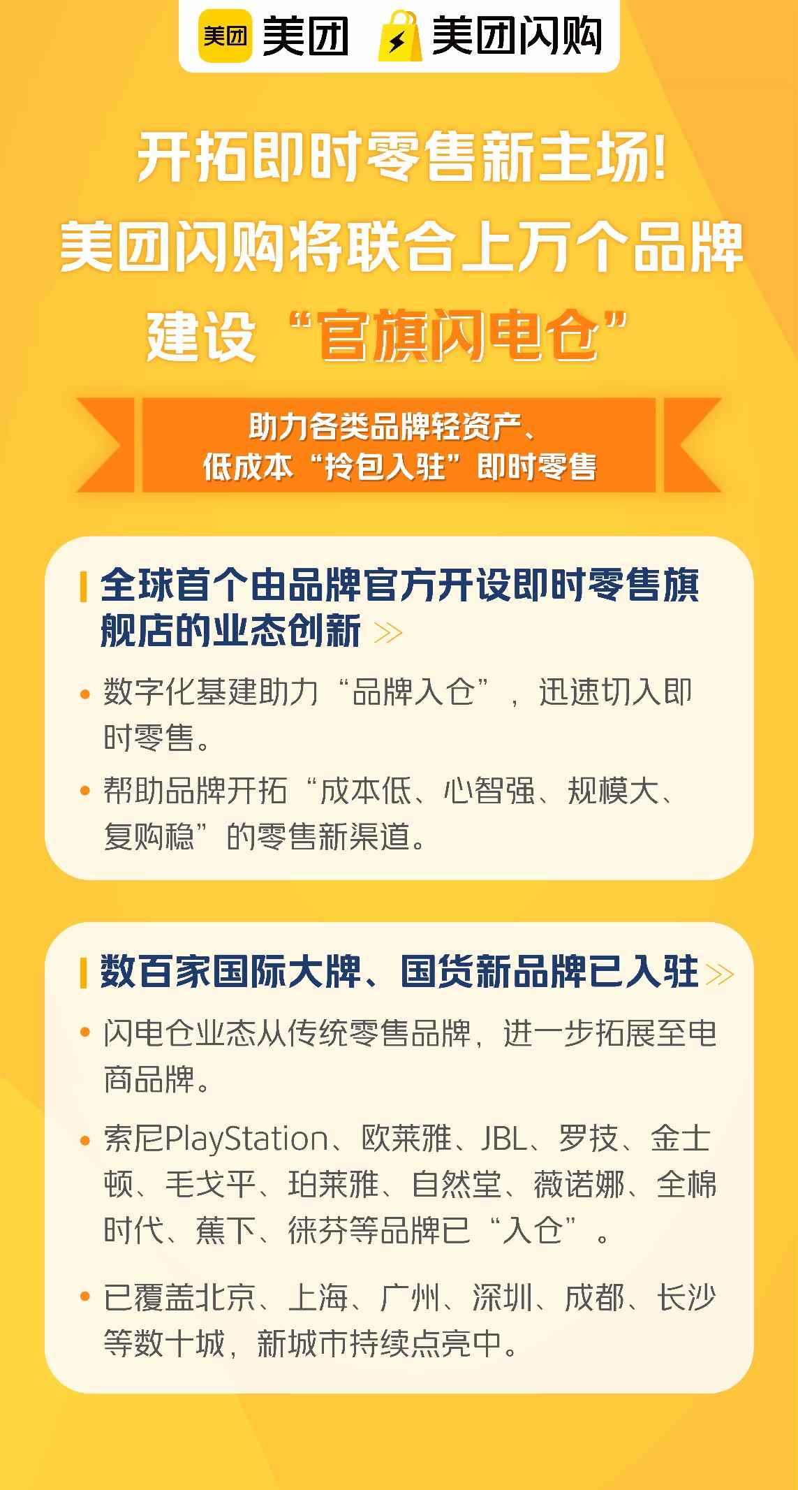 针对大量电商品牌陷入传统平台流量内卷,又缺少渠道拓展机会的问题,美团闪购将提供针对性解决方 案"品牌官旗闪电仓",通过为品牌搭建仓储、配送、数字化系统等"基建",使品牌实现"成本更低、心 智更强、规模更大、复购更稳"的新增长,不必在传统平台上被迫参与价格内卷,"左手流量倒右手"。 据了解,目前索尼PlayStation、珀莱雅、罗技、金士顿、毛戈平、欧莱雅、蕉下、徕芬等超百个品牌已 经率先入驻"品牌官旗闪电仓",北京、上海、广州、深圳、成都、长沙等数十个城市的消费者可在上述 品牌开设在美团闪购的"官方旗舰店"购物。 继昨日超百家品牌官宣入驻美团"品牌官旗闪电仓"后,今日美团官方微信发布消息称,美团闪购正式推 出面向国内外品牌的全套增长解决方案,将为缺少线下渠道的电商品牌、成熟的快消品牌及全行业零售 商家提供针对性增长方案。 此外,美团方面表示,将针对成熟的快消品牌推出多项旨在提升流转效率、加快商品创新的数智化工 具,也将向全行业各类零售商家投入更多研发资源,提供美团牵牛花等数字化"基建",及多项AI辅助即 时零售经营工具。伊利、青岛啤酒、百事、苏菲、宝洁等国内外品牌已与美团闪购相关业态深度合作。 今年以来,即 ...