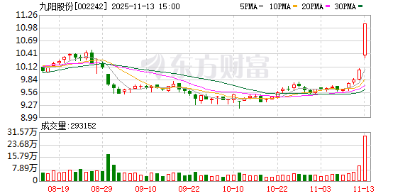 近日,一款名为"哈基米南北绿豆浆"的商品在网络平台爆火,吸引不少网友慕名购买。 商品详情页面显示,九阳豆浆的这款产品名称为"哈基米南北绿豆豆浆植物饮料",配料为大豆、绿豆、水、白砂糖、冰糖。15袋售价29.9元,已售19.4万 单,由于购买量过大已无现货,目前处于预售状态,最晚45天内发货。 据了解,网友口中的"哈基米南北绿豆"一梗源于各种改编神曲。在社交平台上,日语"哈基米"通常被当作猫咪的代名词,一些博主在对经典歌曲的改编当 中,融入了"哈基米""南北绿豆"等词语,再附加魔性的拟声词,创作出了许多音乐,如《蓝莲哈》《基米说》。随后,许多网络视频配以该音乐作为背景 音乐,使得"哈基米南北绿豆"一梗广为流传。 11月12日,九阳豆浆发布短视频称,哈基米南北绿豆浆上新。 在官方直播间,带货主播一直放着哈基米的背景音乐,还会跟着音乐一起唱歌,网友们纷纷在弹幕留言点歌玩梗。 从店铺资质证照看到,企业名称为杭州九阳豆业有限公司,注册资金1675万元,法人姓名为蔡秀军。 值得一提的是,伴随着"哈基米南北绿豆"豆浆的爆火,11月13日早盘,九阳股份开盘直线拉升,封死涨停,股价报11.06元。 | ( 日 | 九阳股份(0 ...