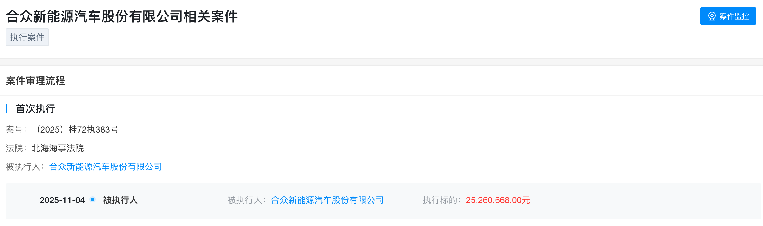 天眼查法律诉讼信息显示,11月4日,哪吒汽车关联公司合众新能源汽车股份有限公司新增一则被执行 人信息,执行标的2526万余元,执行法院为北海海事法院。合众新能源汽车股份有限公司成立于2014年 10月,法定代表人为方运舟,注册资本约28.37亿人民币,经营范围包括新能源汽车整车及零部件的设 计开发、生产、销售及相关的咨询服务等。股东信息显示,该公司由南宁民生新能源产业投资合伙企业 (有限合伙)、北京华鼎新动力股权投资基金(有限合伙)、宜春市金合股权投资有限公司等共同持 股。天眼风险信息显示,该公司现存3条被执行人信息,被执行总金额超2591万余元。此外,该公司还 存在多条限制消费令、股权冻结信息。 ...